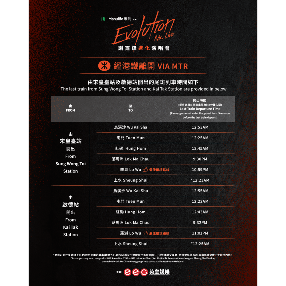 《Evolution Nic Live謝霆鋒進化演唱會》入場指南。(英皇娛樂) - 啟德體育園內不設泊車位,請避免駕駛私家車前往會場。