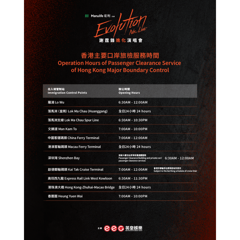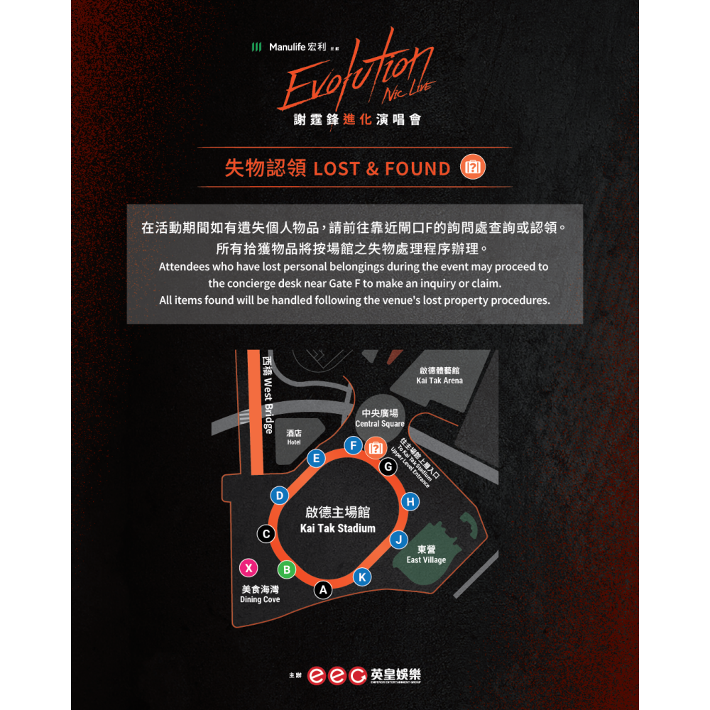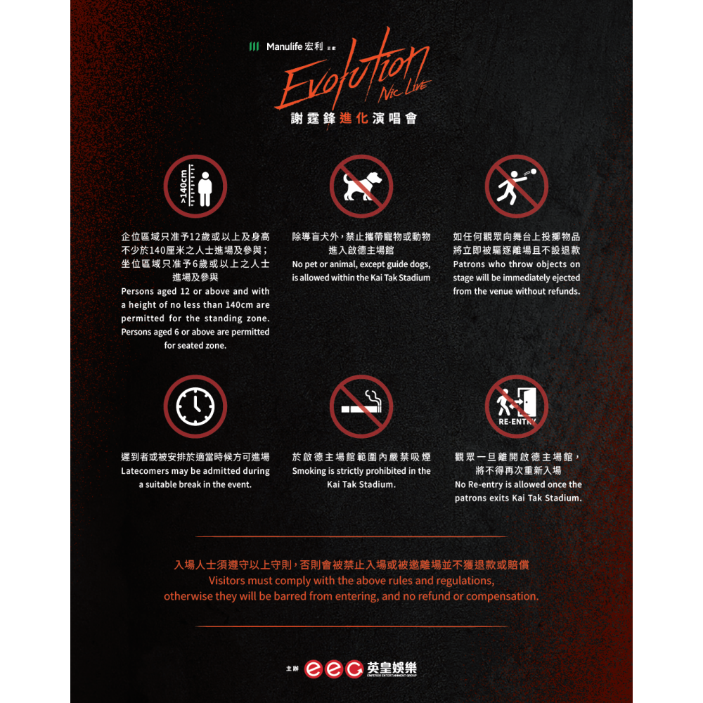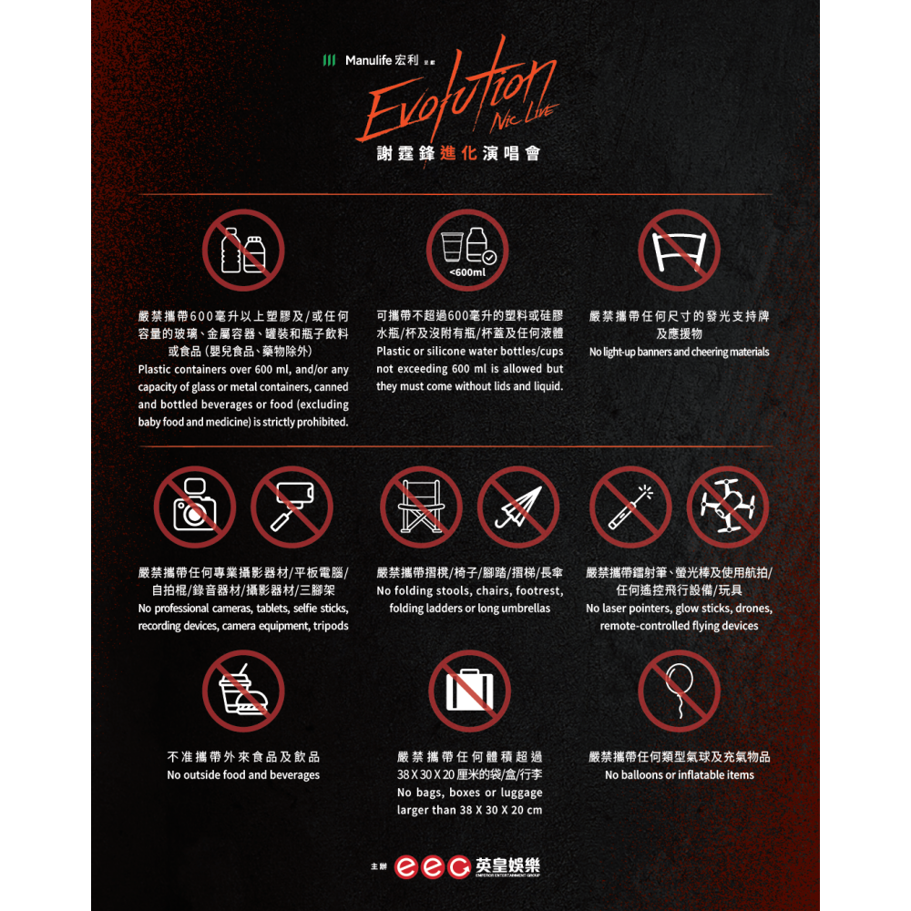《Evolution Nic Live謝霆鋒進化演唱會》入場指南。(英皇娛樂) - 需寄存行李的人士,視乎人流情況,入場或離場時可能需排隊寄存/領回物品,請預留足夠的時間寄存/取回物品,以免耽誤入場時間或錯過計劃乘搭的交通服務。