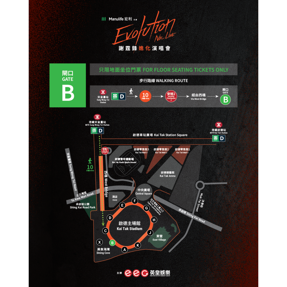 《Evolution Nic Live謝霆鋒進化演唱會》入場指南。(英皇娛樂) - 到其他閘口入場的觀眾可經西橋(較近港鐵宋皇臺站)或中央廣場(較近港鐵啟德站)前往閘口。