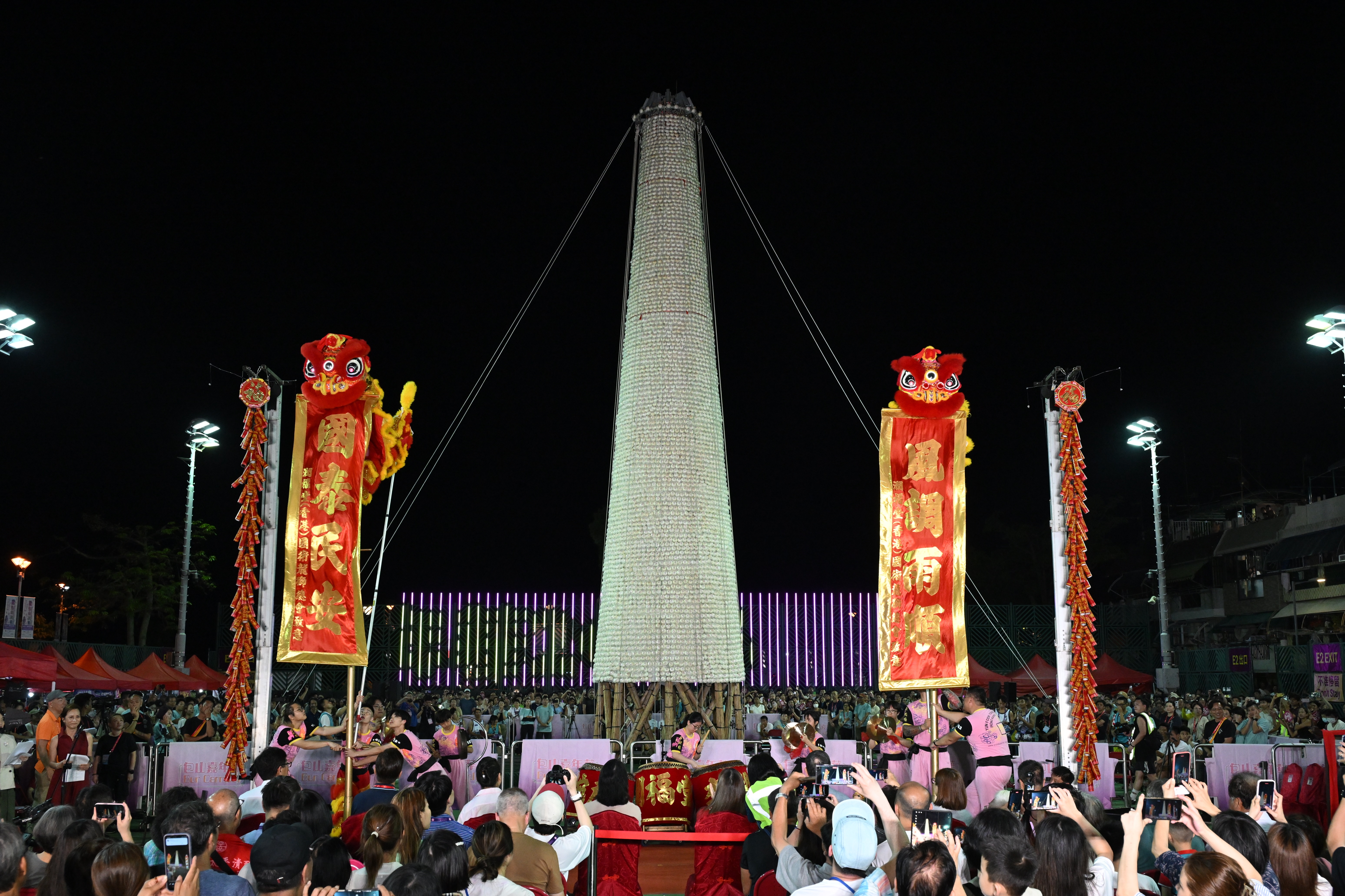 【點新聞報道】「包山嘉年華2025」壓軸項目「搶包山決賽」今日(6日)凌晨在長洲北帝廟遊樂場足球場舉行。今次比賽中,12名選手皆在限定時間內摘取包山上的平安包並返回地面,無人被DQ。