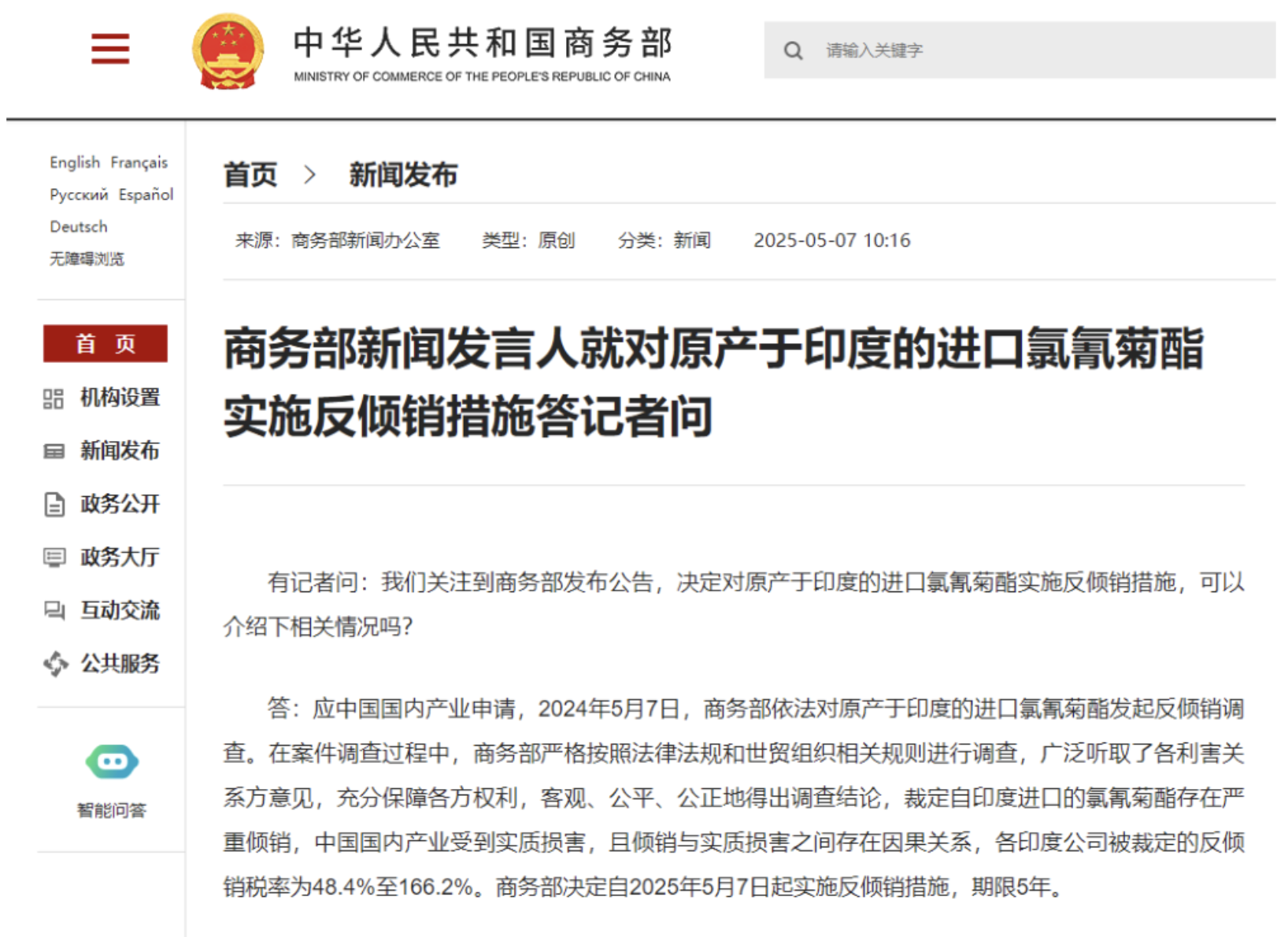發言人表示,應中國國內產業申請,2024年5月7日,商務部依法對原產於印度的進口氯氰菊酯發起反傾銷調查。在案件調查過程中,商務部嚴格按照法律法規和世貿組織相關規則進行調查,廣泛聽取了各利害關係方意見,充分保障各方權利,客觀、公平、公正地得出調查結論,裁定自印度進口的氯氰菊酯存在嚴重傾銷,中國國內產業受到實質損害,且傾銷與實質損害之間存在因果關係,各印度公司被裁定的反傾銷稅率為48.4%至166.2%。商務部決定自2025年5月7日起實施反傾銷措施,期限5年。