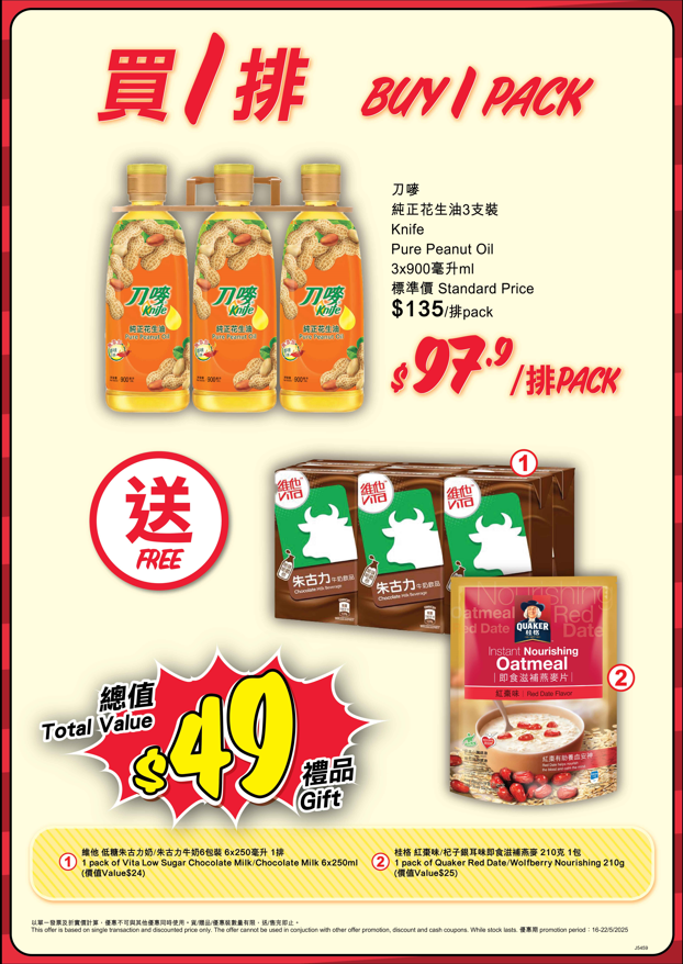 即日起至5月22日,購買1排刀嘜純正花生油3支裝,即送總值$49禮品(包括維他低糖朱古力奶/朱古力牛奶6x250毫升、桂格紅棗/杞子銀耳味即食滋補燕麥210克)。購買6罐金寶湯罐頭湯/意粉醬,即送總值$39禮品(包括營多傳統印尼撈麵5x858克、史雲生清雞湯(澳洲)250毫升、是蜜味茄汁焗豆220克)。