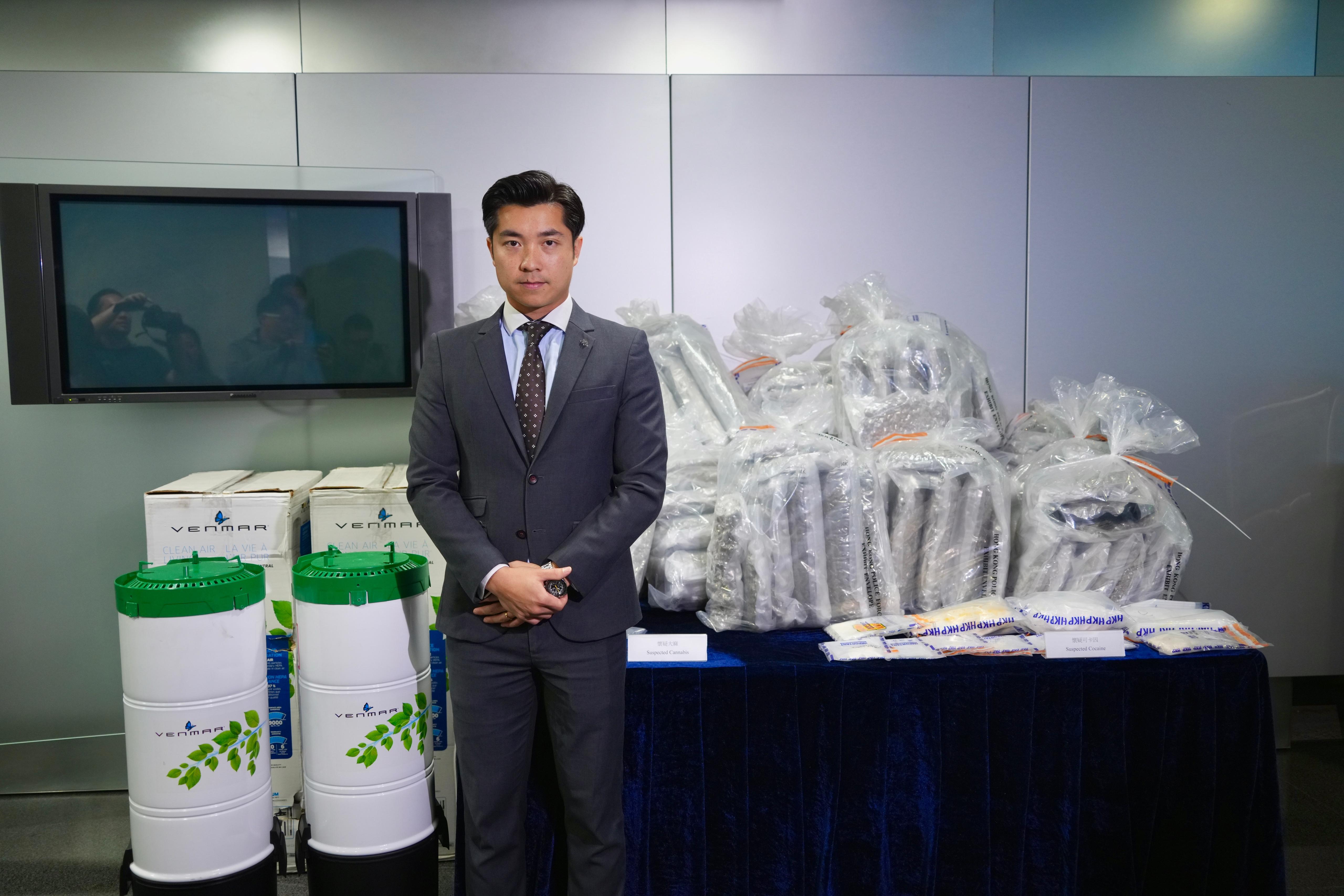 警方毒品調查科高級督察何灝庭簡介案情,指經調查相信販毒集團從加拿大將大批懷疑大麻花運抵香港,並偽裝為工業用吸塵機以掩人耳目。警方遂展開監控行動,追蹤該批貨物的運送過程。5月16日下午,該批藏有懷疑大麻花的貨物被運送至錦田元岡新村。兩名本地男子在現場進行拆貨,並提取隱藏於工業用吸塵機內的懷疑大麻花。警方隨即採取行動,截查並以「販運危險藥物罪」拘捕姓楊(48歲)及姓劉(55歲)兩名男子,二人均報稱無業。經清點,警方檢獲150包真空包裝的懷疑大麻花,總重約102公斤。