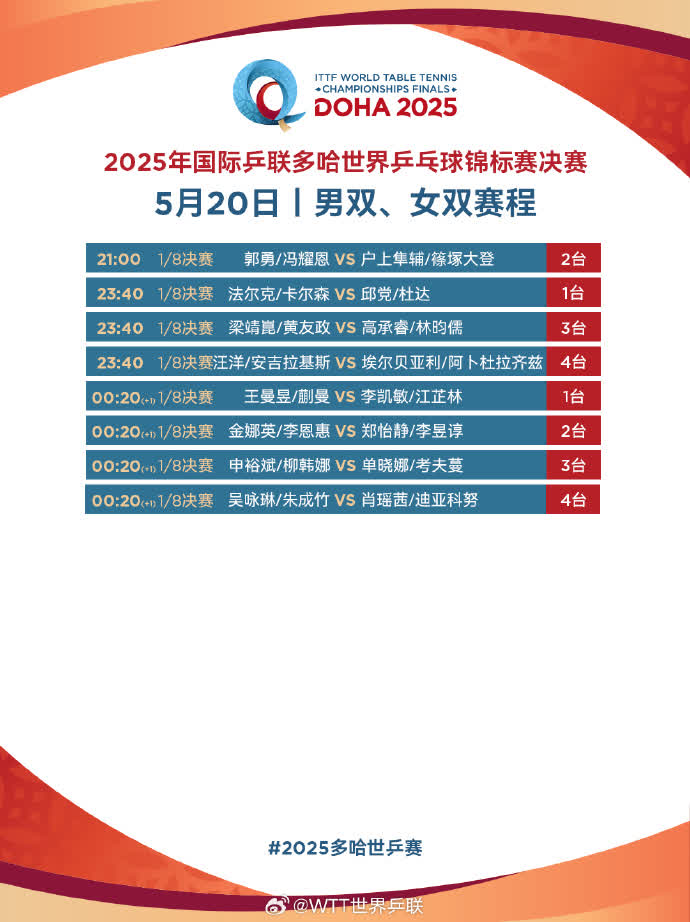 多哈世乒賽|「黃杜配」衝混雙8強 第四日賽程來了!