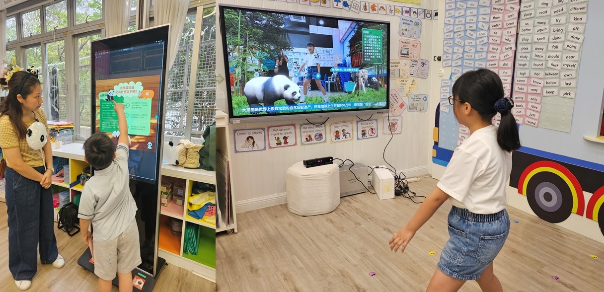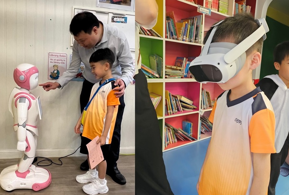 學校邀請了「知書閱聽圖書館」同日舉行沉浸式元宇宙文化體驗展——大熊貓的故事,展內設有多種元宇宙體驗裝置,包括AI智能機械人為學生讀繪本、講故事,學生們戴上VR眼鏡親近大熊貓,也可以在AR世界中模擬與瀕臨絕種動物互動,探索大熊貓的奇妙世界。