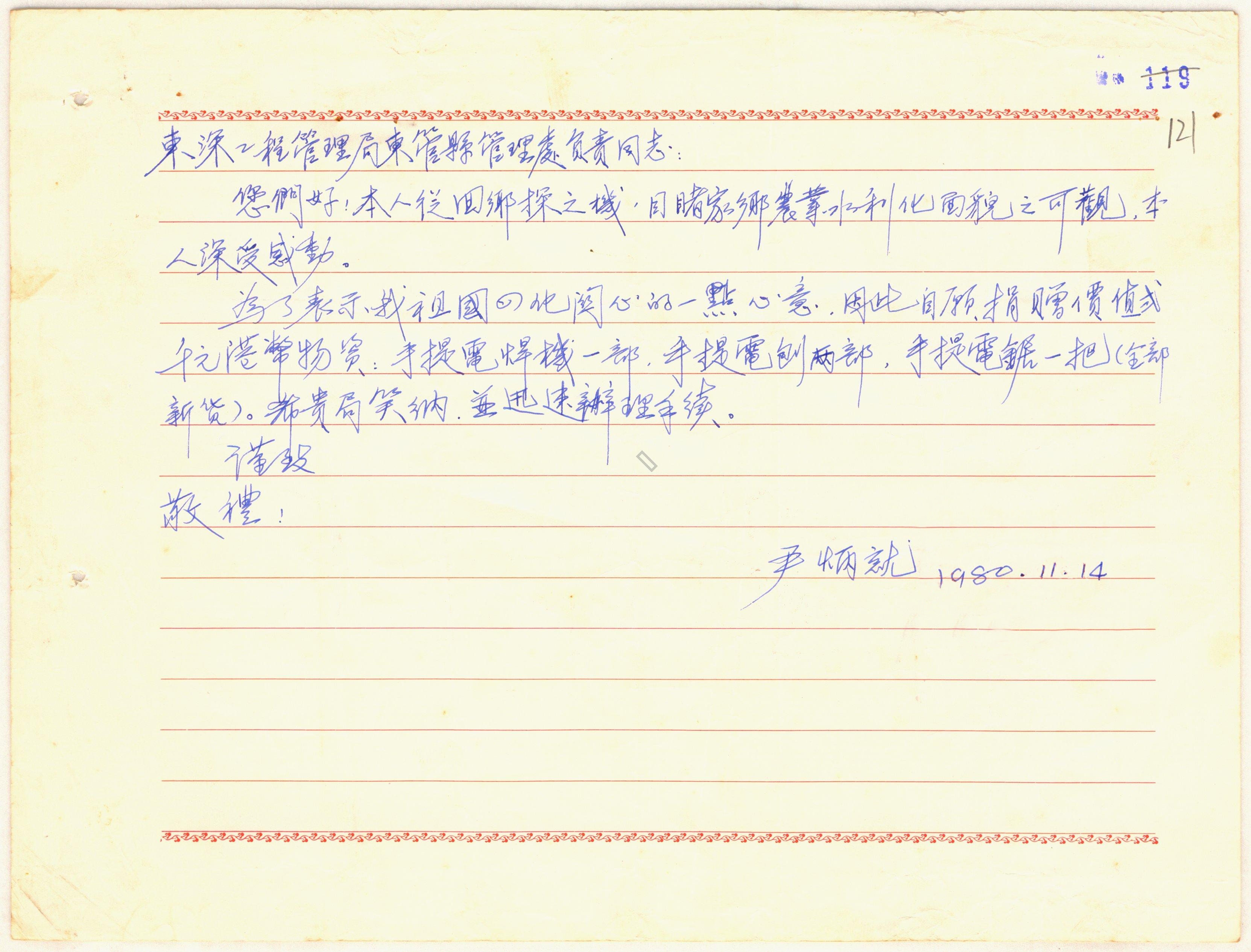 在這些檔案中,包括三封香港同胞來信,信中用真摯感人的語言,表達港人對廣東無私向香港供水、解決同胞飲水困境的感激之情,還主動提出將「手提電焊機、手提電刨、三門六座位工具汽車」等物資自願捐贈給東深供水工程指揮部,用以「支持祖國建設」,淳樸之情令人動容。