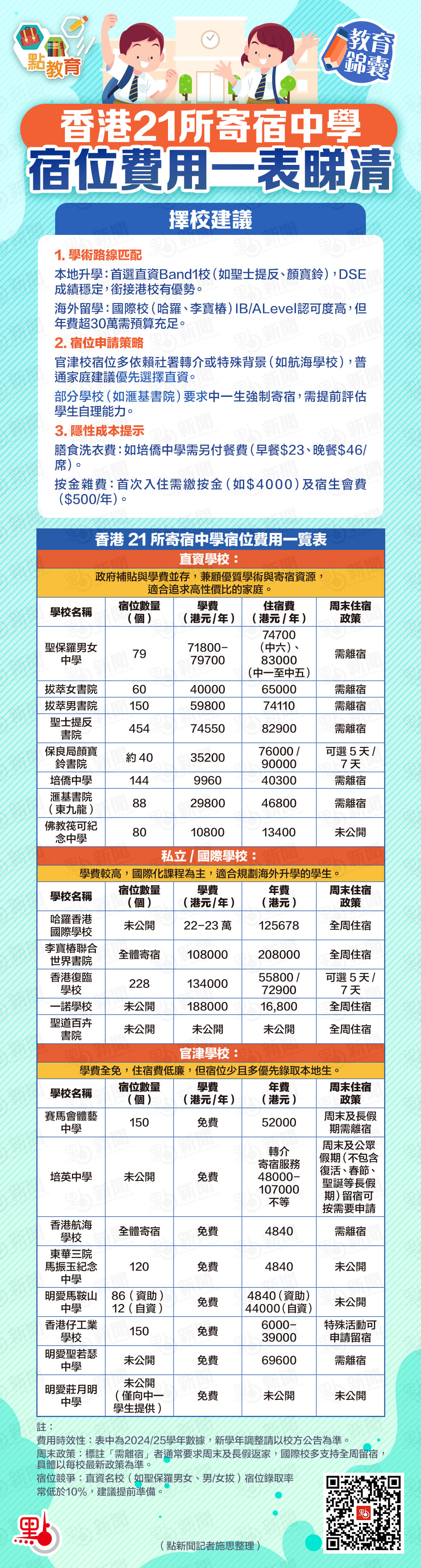 教育錦囊|香港21所寄宿中學宿位費用一表睇清