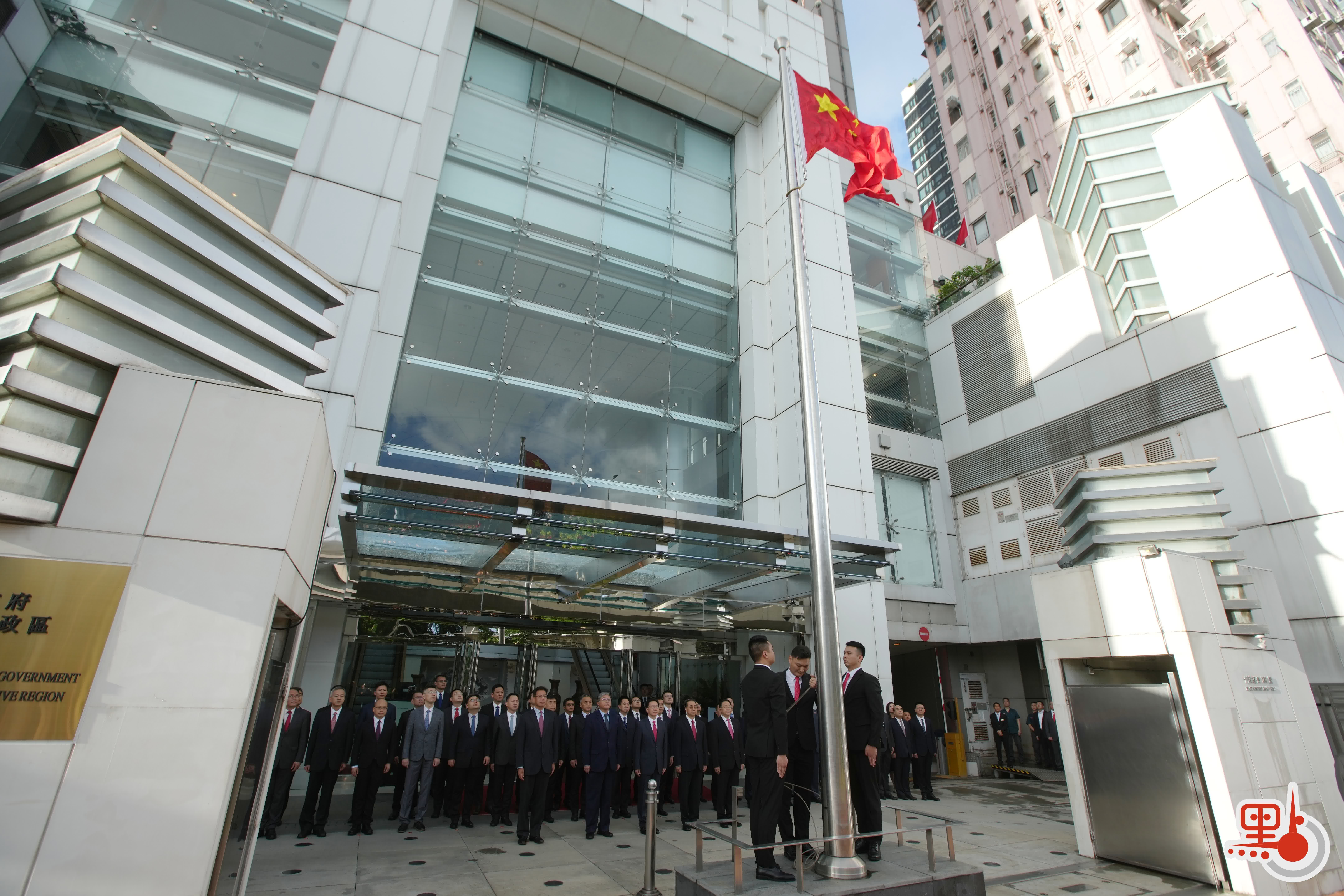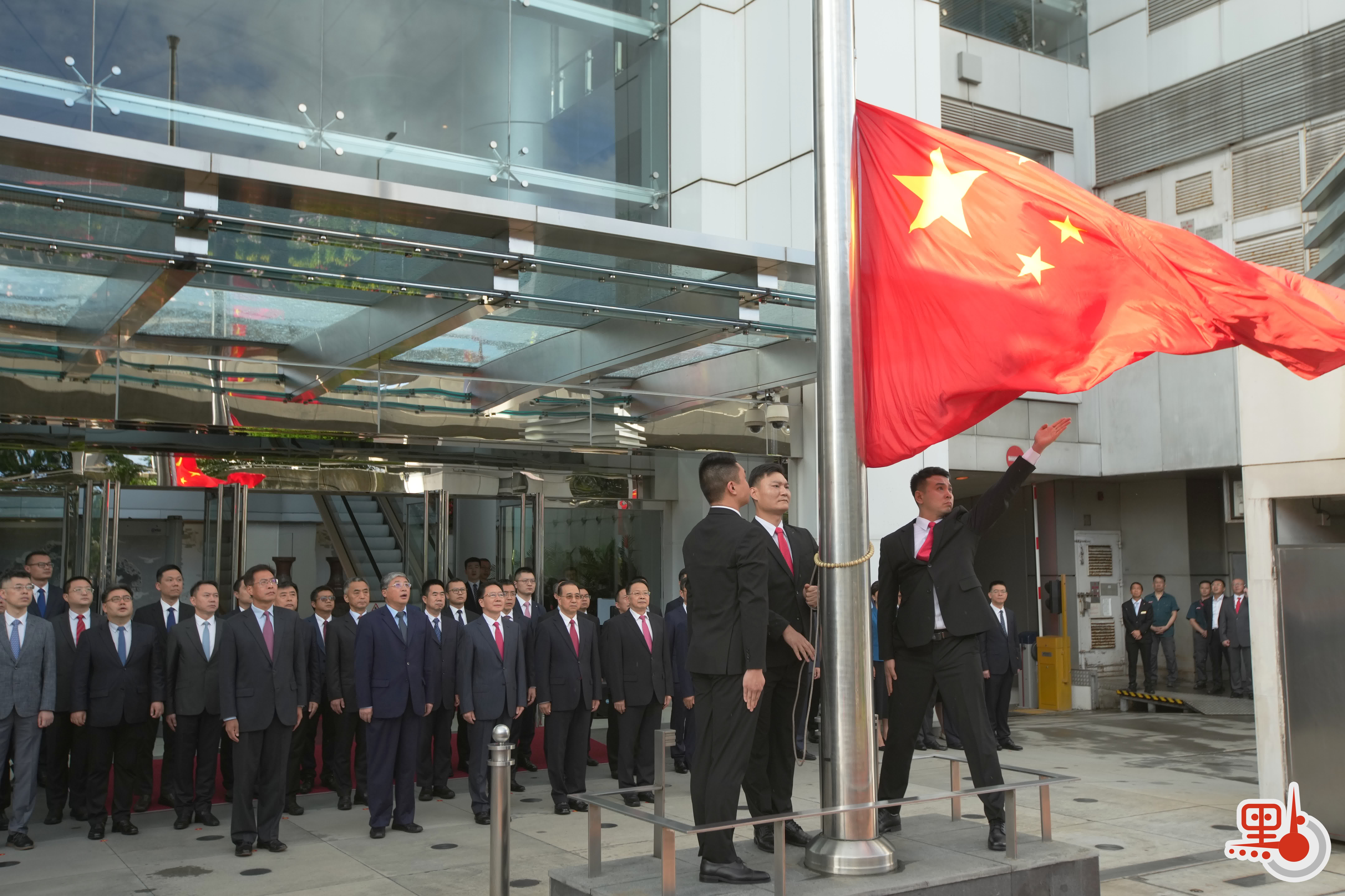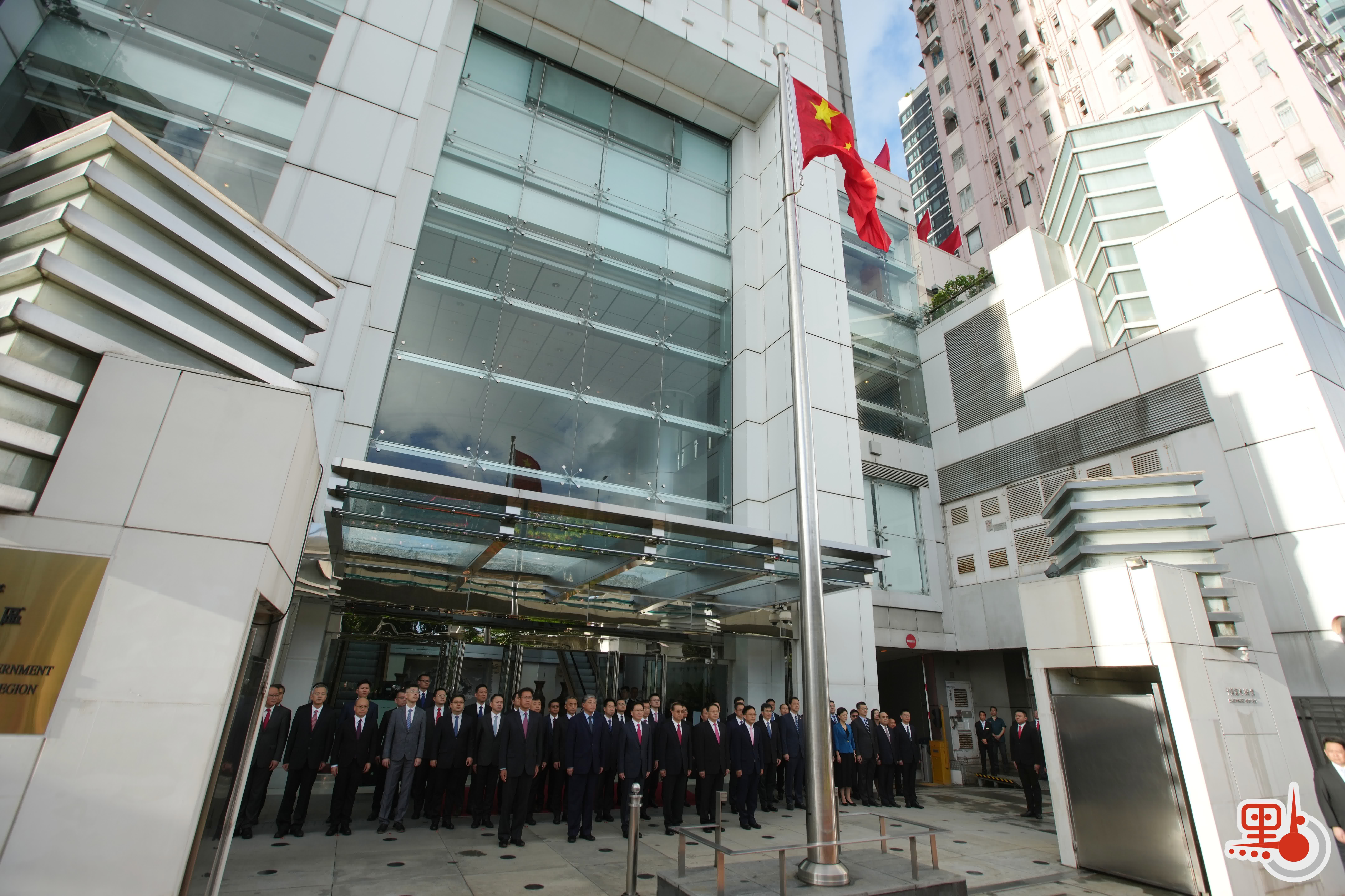 上午7時,升國旗儀式開始。中央政府駐港聯絡辦主任周霽,副主任劉光源、羅永綱、尹宗華、祁斌和秘書長王松苗,以及幹部員工代表在辦公樓前莊嚴肅立。升旗手步伐鏗鏘,護送國旗走向升旗台。伴隨着雄壯激昂的國歌聲,五星紅旗冉冉升起,鮮艷奪目。全體人員向國旗行注目禮,齊聲高唱國歌,表達對祖國和香港的美好祝願。