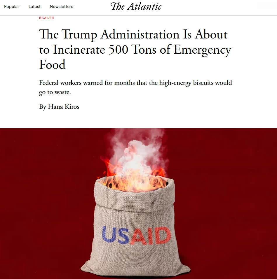 【點新聞報道】據環球時報援引美國《大西洋月刊》網站14日報道,多名現任和前任美國國際開發署(USAID)工作人員透露,美國特朗普政府已下令焚燒銷毀約500噸援助食品。這批食品原計劃發往阿富汗和巴基斯坦,可供約150萬名兒童食用一周。