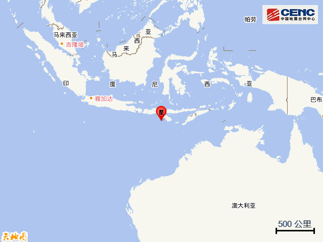 印尼松巴哇島南部海域發生5.3級地震。(中國地震台網)