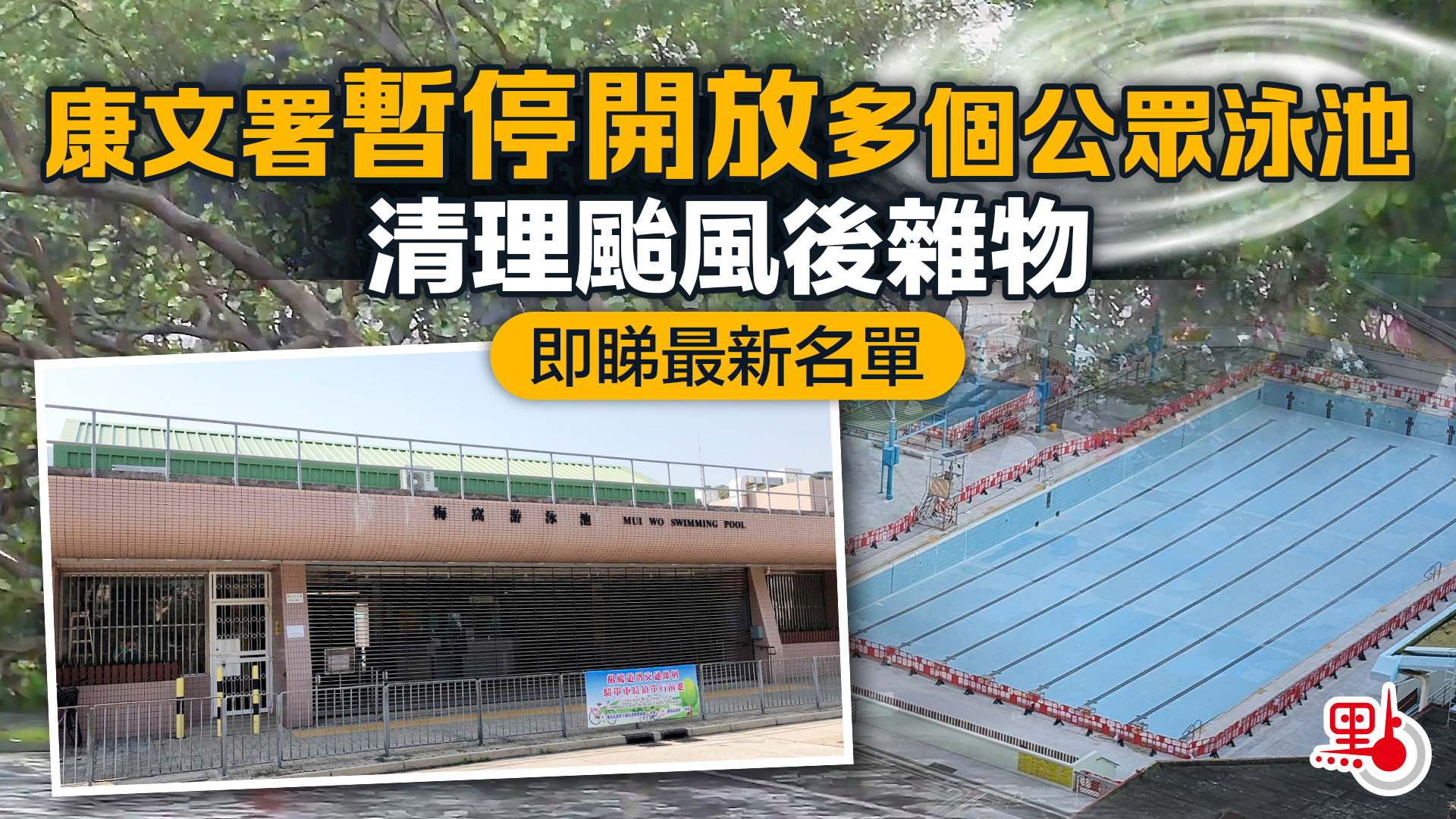 南區包玉剛游泳池、深水埗區李鄭屋游泳池、深水埗公園游泳池、葵青區葵盛游泳池、屯門區屯門游泳池、離島區梅窩游泳池及東區柴灣游泳池一度暫停開放,經過一夜清理今日陸續重開。