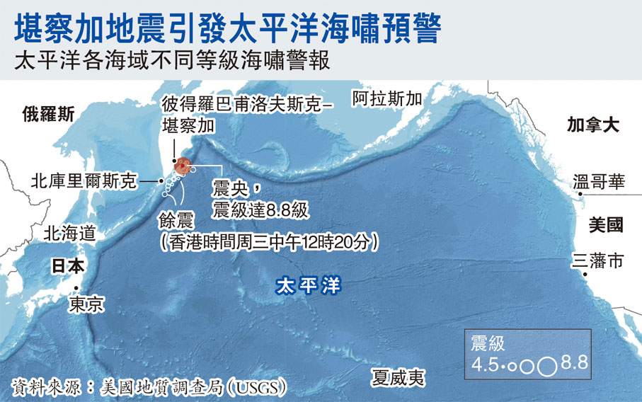 香港文匯報綜合報道,俄羅斯遠東堪察加半島附近海域周三(7月30日)發生黎克特制8.8級強烈地震,是全球有紀錄以來第六強烈的地震,也是全球自2011年日本「311」大地震以來錄得最強烈的地震。地震引發大規模海嘯,俄羅斯、日本、美國與拉丁美洲多國等環太平洋沿岸國家,周三均先後發布海嘯警報。地質學家指餘震預計會持續至少一個月,呼籲各地民眾留意避災。