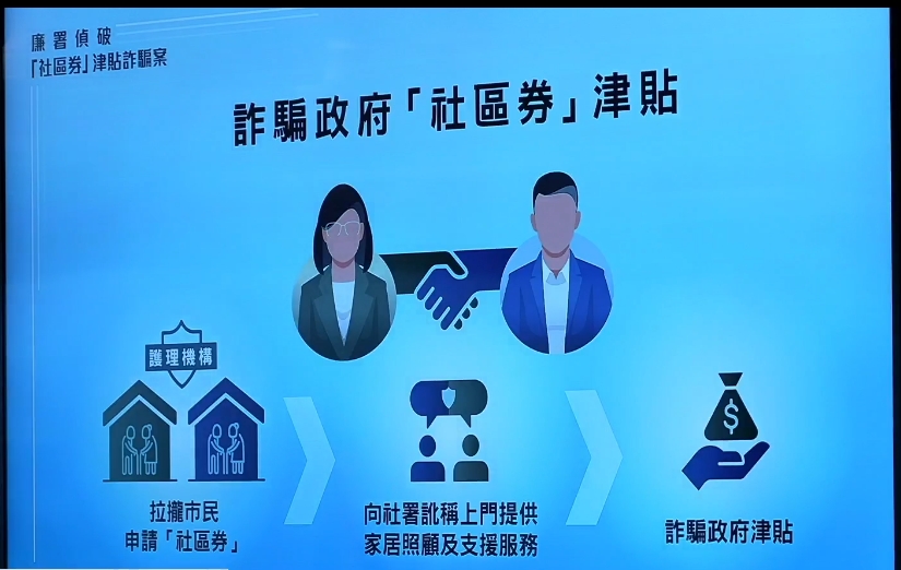 廉署表示,早前接獲社署轉介貪污投訴,懷疑有人以不法貪污手段,透過社署「社區券」詐騙政府津貼。廉署經深入調查後,上月採取執法行動,拘捕2男3女,年齡介乎27歲至57歲。該5名被捕人士中,案件主腦為一名註冊護士及一名註冊職業治療師,他們各自經營一間私營護理機構,其餘3人為護理機構員工。兩名案件主腦早前共同經營一間私營護理機構,2024年中旬拆夥成兩間,註冊時間分別為2019年及2024年6月,相信初期是為長者提供合資格服務的正規註冊機構。惟案發期間,被捕人士利用醫療專業身份及廣闊人脈關係,拉攏教唆一些不熟悉社區券計劃的市民,叫他們身邊老人家參加計劃,亦向社署訛稱該兩間護理機構曾上門為長者提供家居照顧服務和支援服務,包括復康運動、護理服務、膳食服務和家居清潔等,詐騙政府批出津貼。