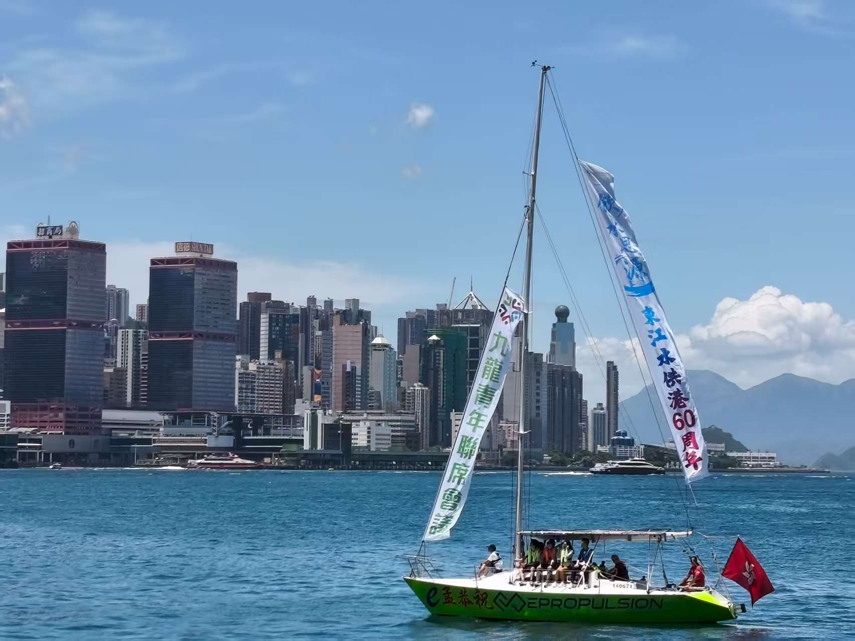 活動現場,「一脈相連 飲水思源」東江水供港60周年活動主題帆船緩緩駛近尖沙咀碼頭,與岸上的嘉賓和青年代表熱情互動。隨後,大家與帆船合照留影,並齊聲高唱《歌唱祖國》,嘹亮的歌聲回蕩在維港上空,充分展現了香港青年對祖國的熱愛與祝福。