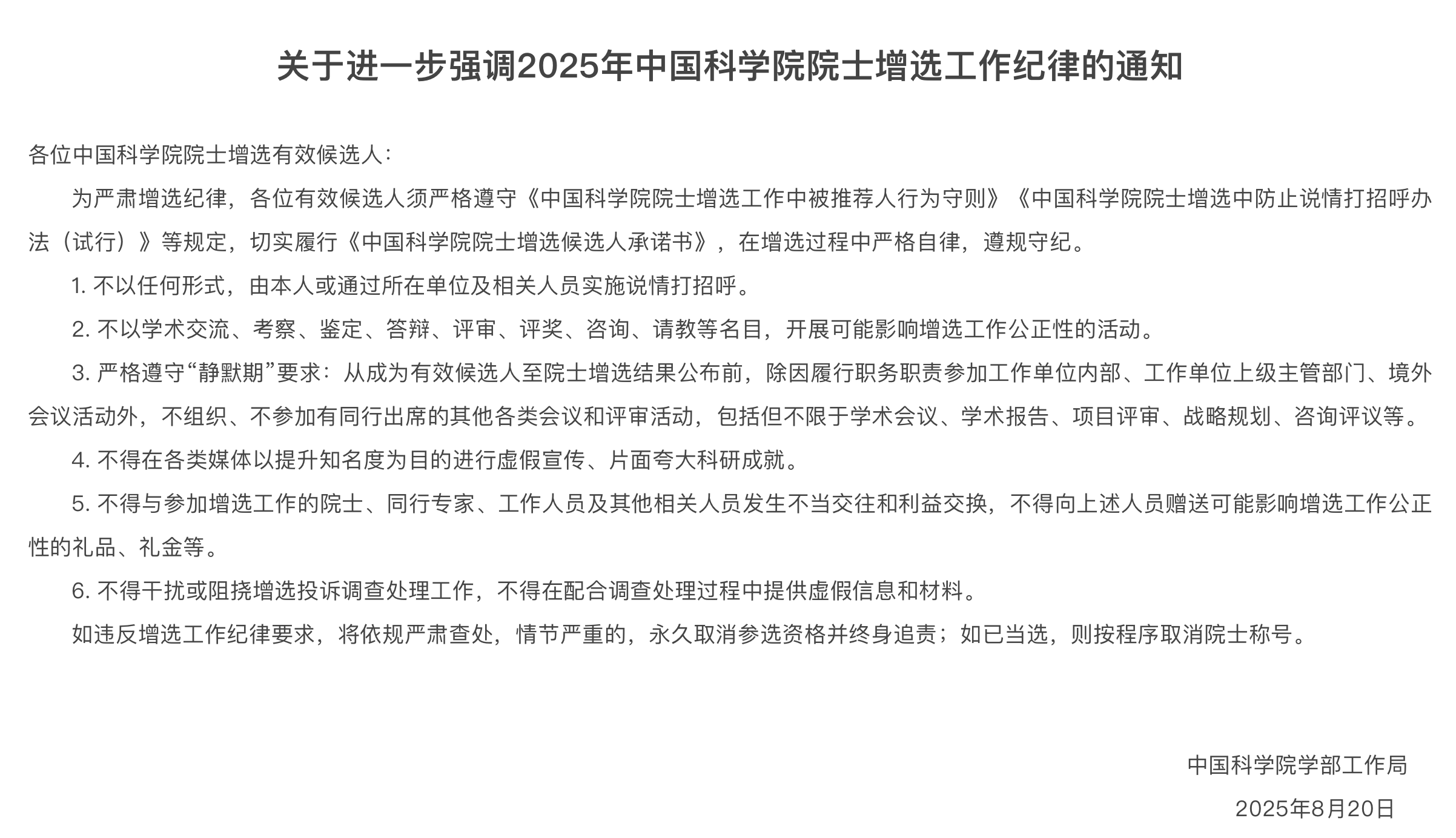 中國科學院、中國工程院兩院再次強調了院士增選的工作紀律。中國科學院指出,有效候選人須嚴格遵守「靜默期」要求,從成為有效候選人至院士增選結果公布前,除因履行職務職責參加工作單位內部、工作單位上級主管部門、境外會議活動外,不組織、不參加有同行出席的其他各類會議和評審活動,包括但不限於學術會議、學術報告、項目評審、戰略規劃、諮詢評議等。此外,不得在各類媒體以提升知名度為目的進行虛假宣傳、片面誇大科研成就。