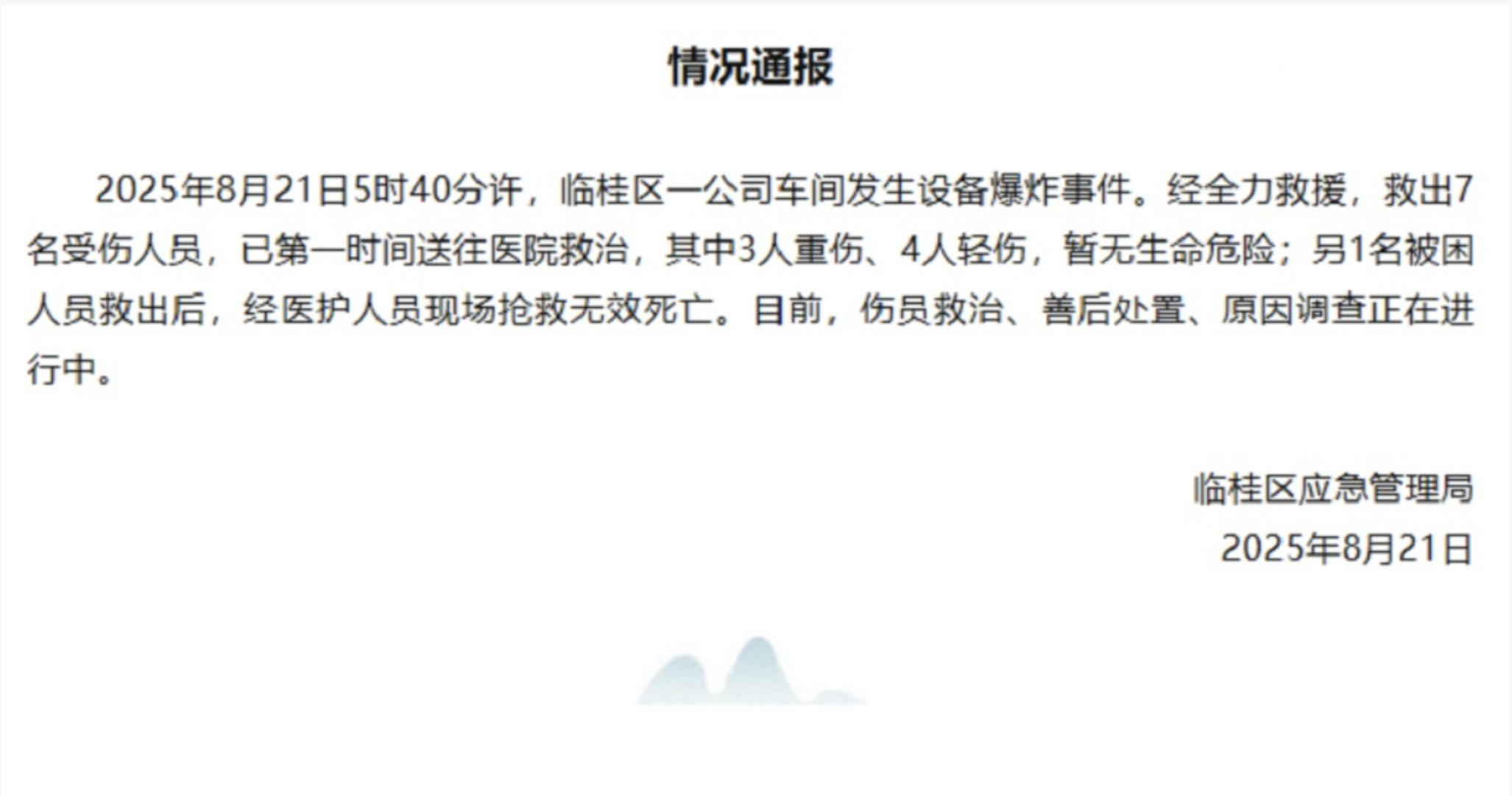 【點新聞報道】據新華社消息,記者從桂林市臨桂區應急管理局獲悉,今日(21日)5時40分許,臨桂區一公司車間設備發生爆炸,事故導致1人死亡7人受傷,其中3人重傷、4人輕傷,暫無生命危險。目前,傷員救治、善後處置、原因調查等工作正在進行中。