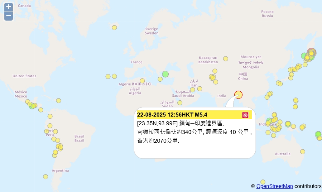 香港天文台表示,香港時間12時56分,緬甸─印度邊界區發生5.4級地震,位於密鐵拉西北偏北約340公里, 震源深度10公里,距香港約2070公里。
