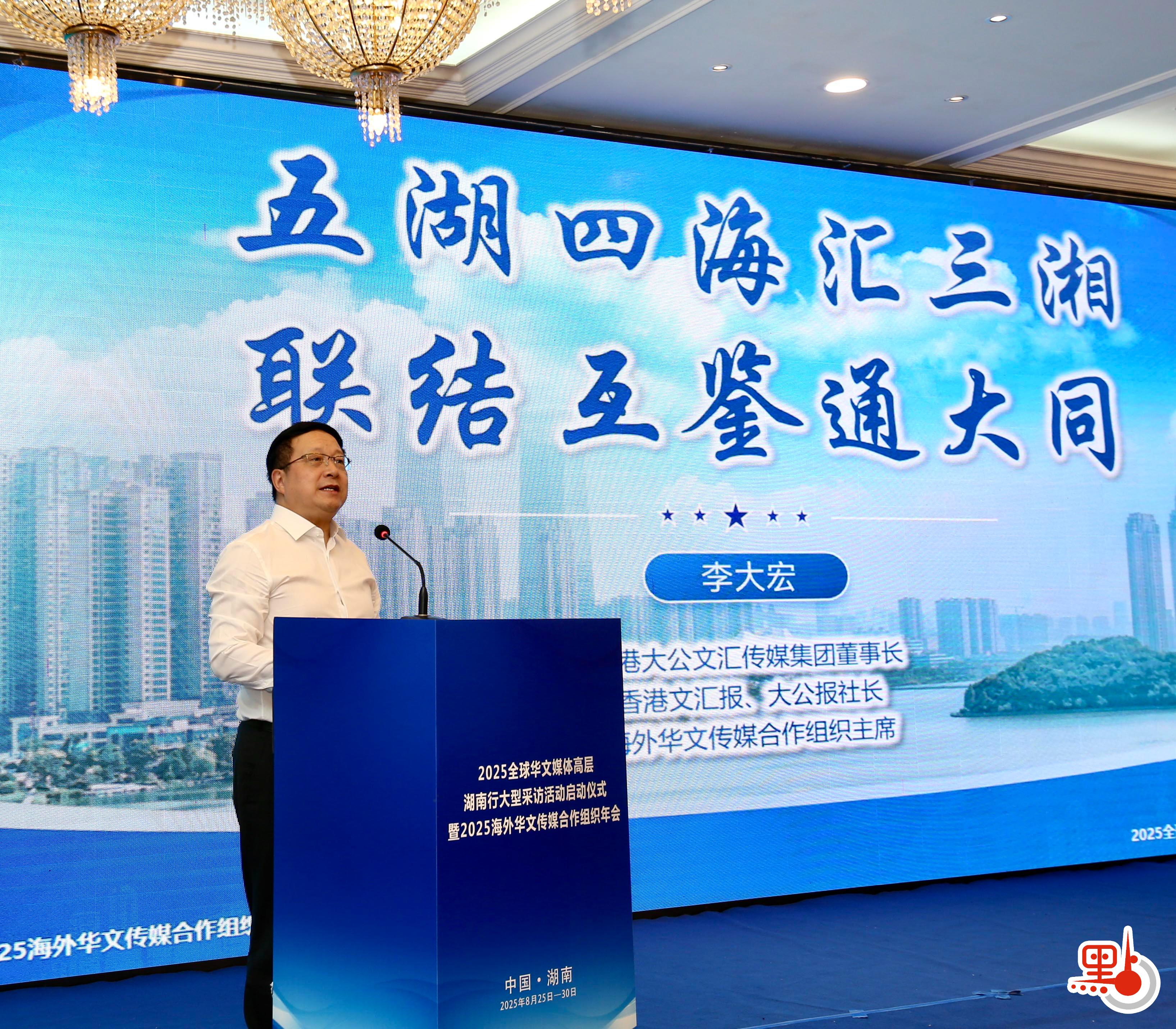 李大宏表示,今年是中國人民抗日戰爭暨世界反法西斯戰爭勝利80周年,民族危亡之際,海外華媒不畏危難,將中國抗戰的消息帶到世界各地,講述着中華民族不甘屈服的抗戰精神,如今我們接過歷史的接力棒,仍要賡續守護紅色記憶、傳遞抗戰精神的使命,要用更鮮活的敘事、更創新的形式,讓年輕一代讀懂歷史、銘記初心,把中國尊重歷史、珍愛和平的態度傳遞給世界。他表示,大文集團與海外華文傳媒合作組織願以此次湖南年會為新起點,與湖南深度交流合作、常來常往,共同推動文明傳播與交流互鑒,讓每一條湖南聲音、中國故事都能跨越山海、永續迴響。
