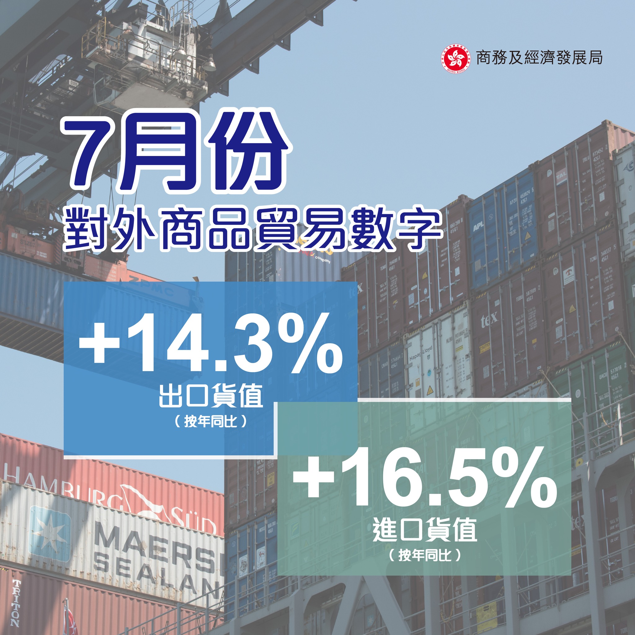 【點新聞報道】政府今日(26日)公布本港7月份出入口貨物價值等對外貿易數據。上月本港整體出口和進口貨值表現強勁,繼續錄得雙位數升幅,分別按年上升14.3%和16.5%。