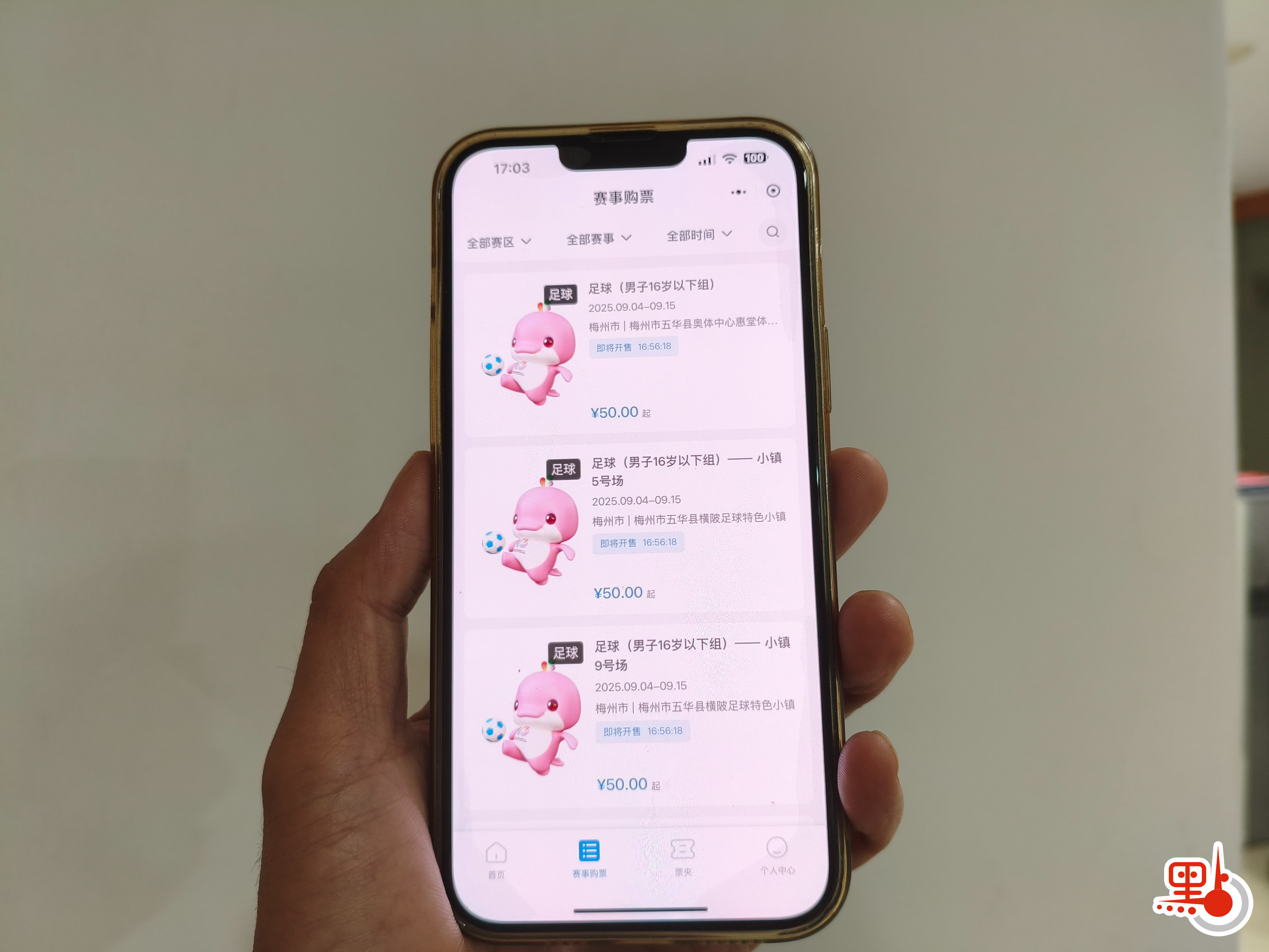 頁面顯示,門票銷售以場館為單元,而非按項目。以足球(男子16歲以下組)為例,比賽分布在四個比賽場館,分別為梅州市五華縣奧體中心惠堂體育場、五華縣橫陂足球特色小鎮(含三個體育場),四個場館分設四個購票欄。也就是說,同樣是男足U16項目,購買五華縣奧體中心惠堂體育場門票無法進入另外三個舉辦同項目的場館觀看比賽。
