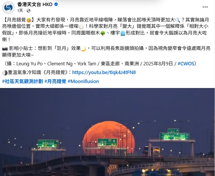 香港天文台於本月26日特別在官方facebook專頁以「月亮錯覺」為題發文解析此現象,並分享拍攝技巧。天文台指出:「大家有冇發現,月亮靠近地平線嗰陣,睇落會比起喺天頂時更加大?其實無論月亮喺邊個位置,實際大細都係一樣㗎!」文中解釋,科學家對月亮「變大」錯覺的其中一項解釋是「相對大小假說」——當月亮接近地平線時,與周圍的樹木、樓宇形成對比,會令大腦產生錯覺,誤以為月亮變大。