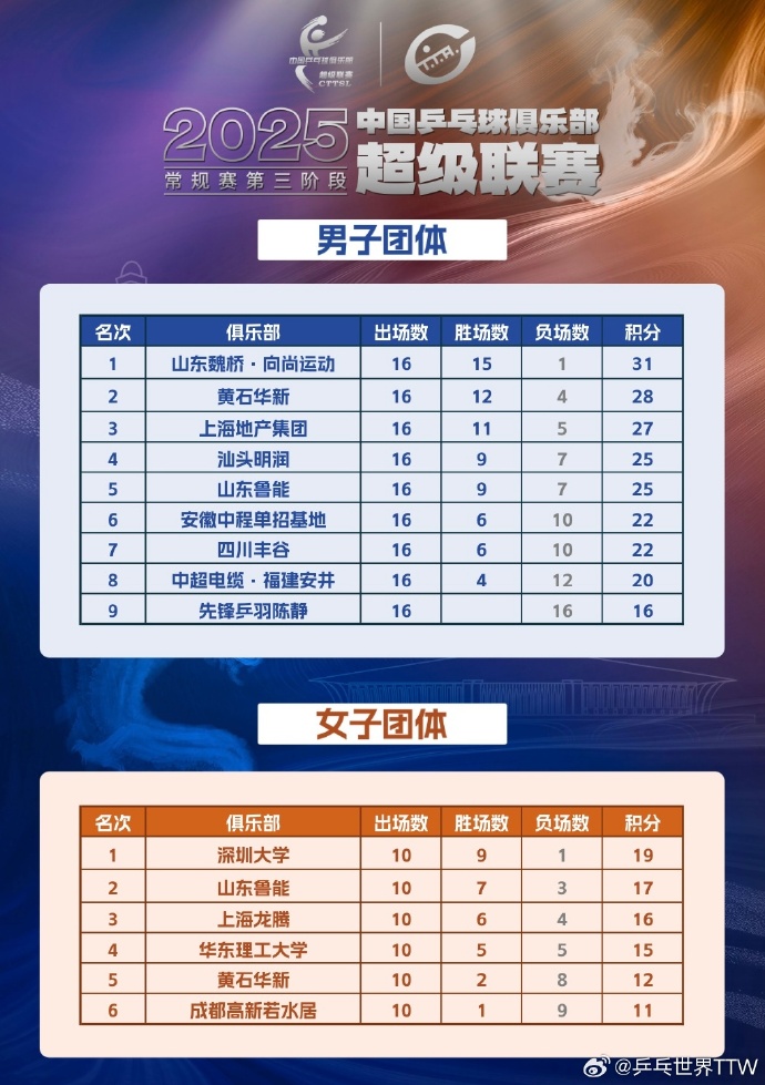 山東魏橋·向尚運動、黃石基地·華新、上海地產集團、汕頭明潤俱樂部晉級2025乒超聯賽男團總決賽。深圳大學、山東魯能、上海龍騰、華東理工大學俱樂部晉級2025乒超聯賽女團總決賽。