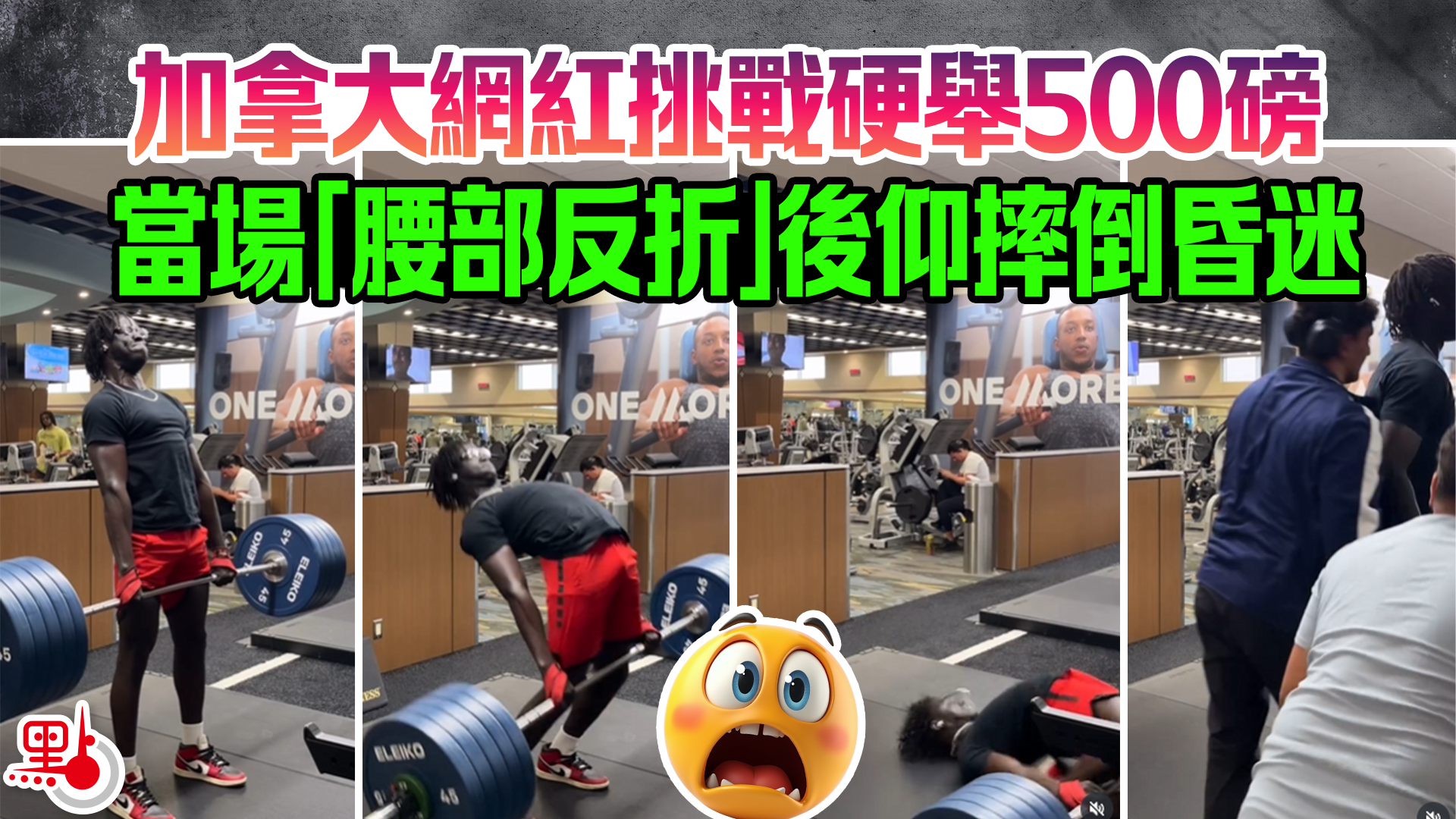 加拿大網紅挑戰硬舉500磅 當場「腰部反折」後仰摔倒昏迷