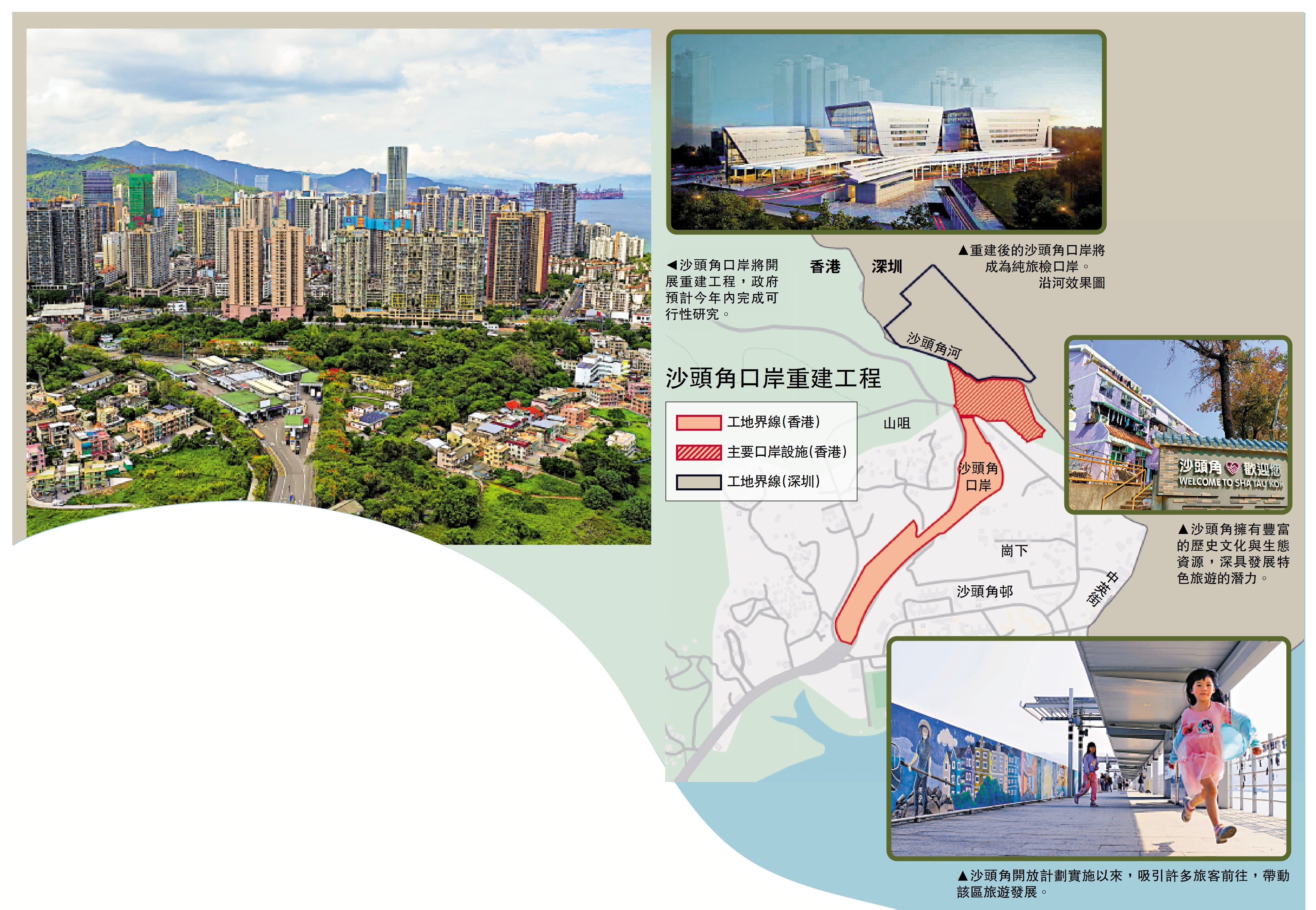 沙頭角在香港北部都會區發展中有着重要角色。已停運的沙頭角口岸將開展重建工程,政府預計今年內完成可行性研究,包括口岸以「跨河建」方式重建,並研究以「人車直達」模式,即在口岸設有公共運輸交匯處及停車場,以公共交通工具接駁。實施「合作查驗、一次放行」通關模式,通關量將由新冠疫情前日均約7300人次,大幅提升至4萬人次。