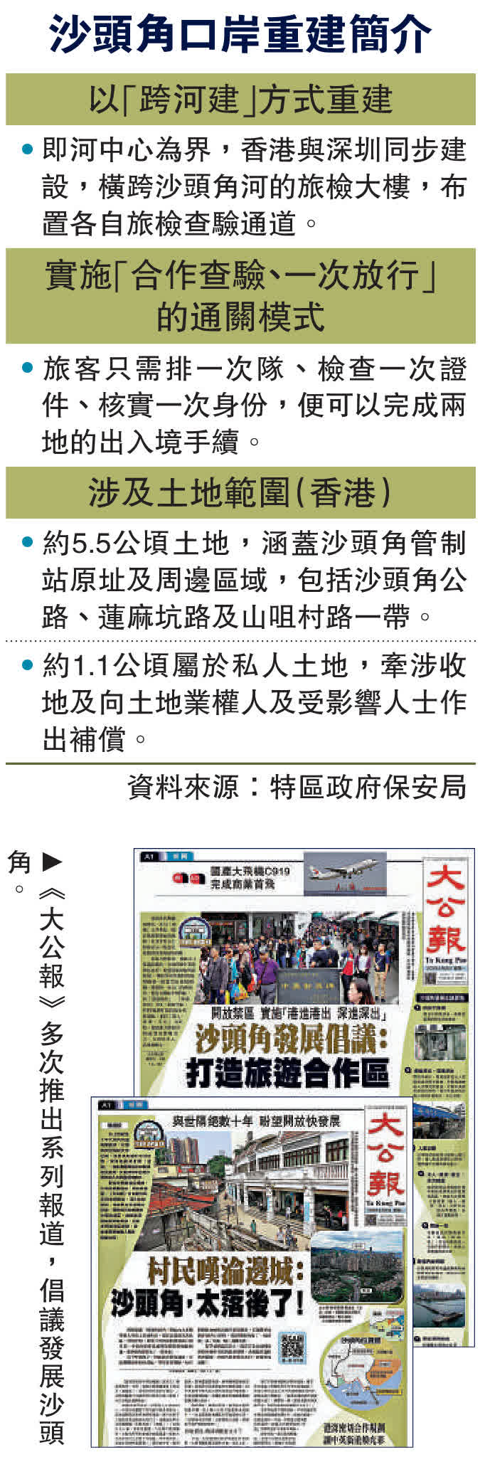 另外,港方重建項目涉及的土地範圍,涵蓋沙頭角管制站原址及部分周邊土地,包括沙頭角公路、蓮麻坑路及山咀村路一帶,初步估算面積約5.5公頃,其中約1.1公頃屬於私人土地。政府將按照有關政策及法例,向土地業權人及受影響人士作出補償。據了解,收地範圍涉及少於10位業權人,相關土地以往曾經用作農地,現時已經荒廢,部分用作租用放置貨物用途,業權人普遍支持發展。
