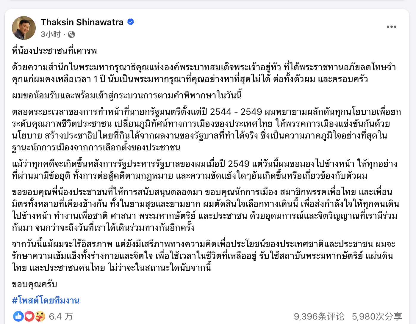 另據環球網報道,他信在社交媒體上發文稱,接受該判決。他信說,自己將保持身心健康,期待過去的事件得到解決,包括涉及他本人的法律糾紛和其他衝突。「從今天起,我雖然(身體上)不自由,但我依然擁有為國家和人民謀福利的思想自由。」他信表示,自己將為泰國國王、為國家、為泰國人民服務。
