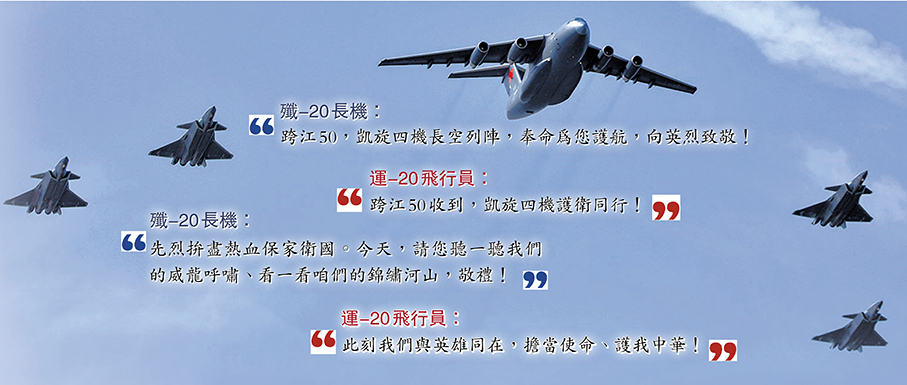 12日上午,空軍運-20專機進入中國領空後,4架殲-20戰鬥機護航。運-20使用「跨江50」呼號,殲-20使用「凱旋」呼號,「雙20」列陣長空告慰先烈。隨後的迎回儀式上,禮兵將裝有志願軍遺骸和遺物的棺槨緩緩覆蓋上鮮艷的中華人民共和國國旗,並護送上靈車。