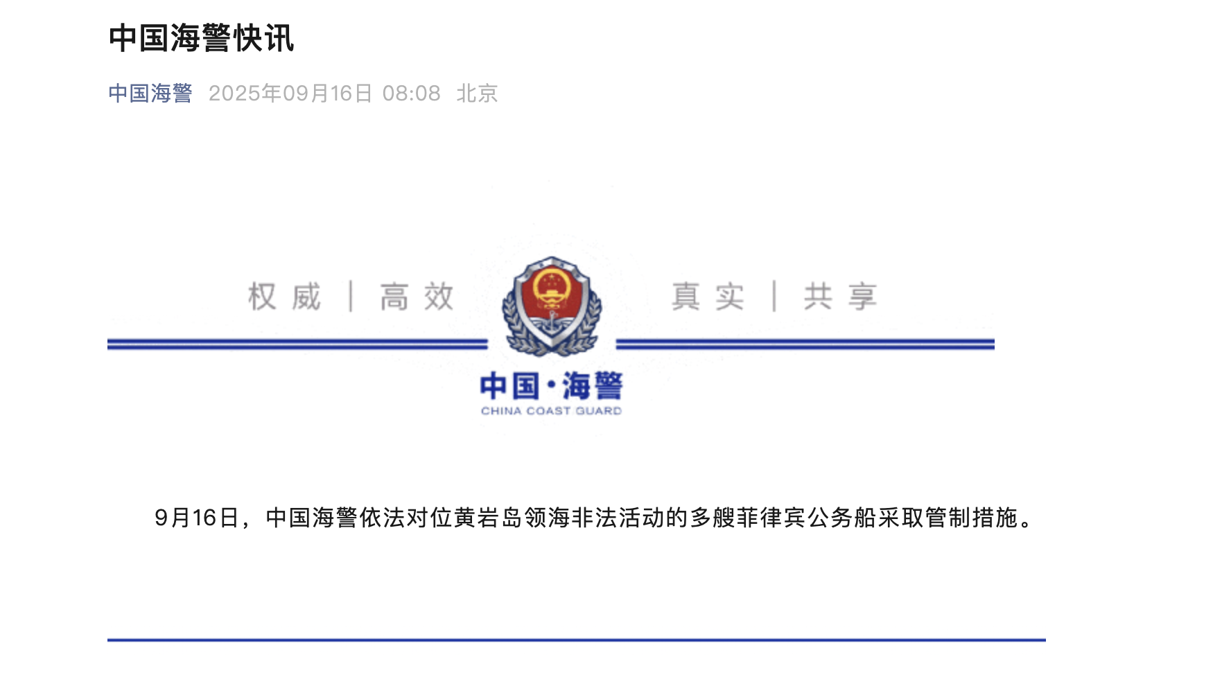 【點新聞報道】據「中國海警」微信公眾號公布,9月16日,中國海警依法對位黃岩島領海非法活動的多艘菲律賓公務船採取管制措施。