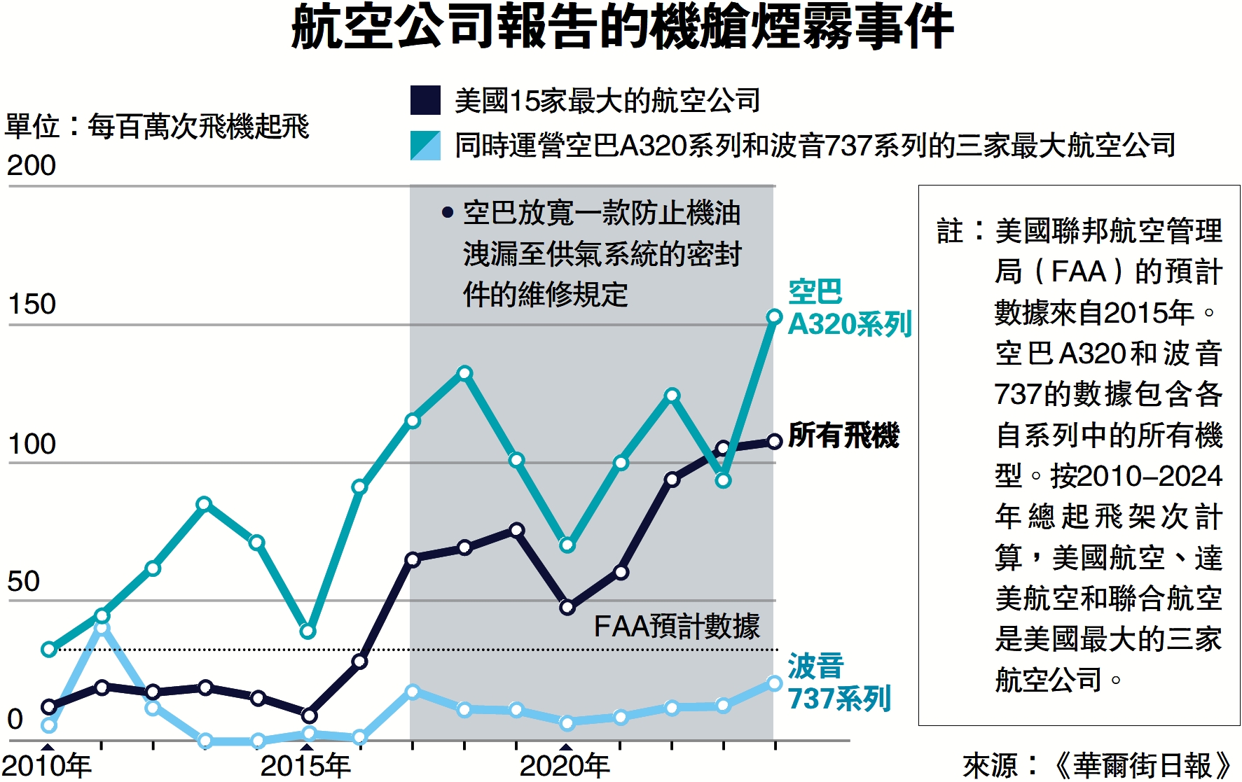 •美國聯邦航空管理局(FAA)引用2015年數據稱,每100萬次飛行中出現毒霧事件少於33次,換算後美國去年有約330宗個案,強調「並不常見」。但《華爾街日報》指出,2014年相關數字為每100萬班客機有約12班會出現毒霧事件,到2024年時急增至近108班,顯示問題近年惡化。