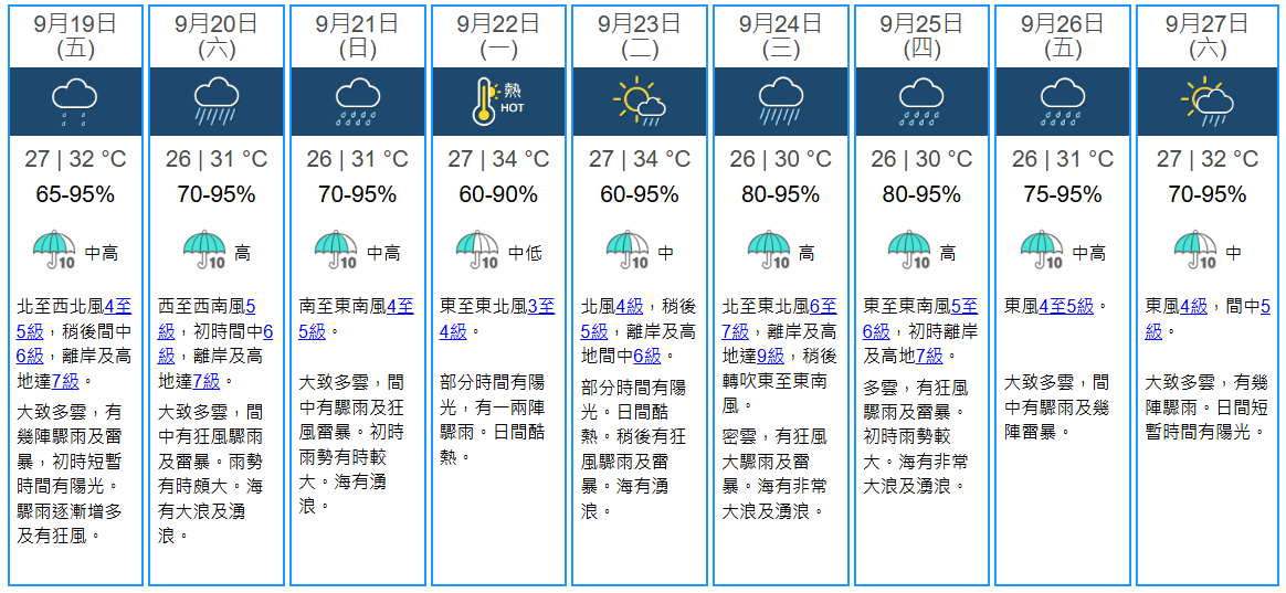 周六(20日)吹西至西南風5級,初時間中6級,離岸及高地達7級;大致多雲,間中有狂風驟雨及雷暴,雨勢有時頗大,海有大浪及湧浪。周日(21日)吹南至東南風4至5級,大致多雲,間中有驟雨及狂風雷暴,初時雨勢有時較大,海有湧浪。