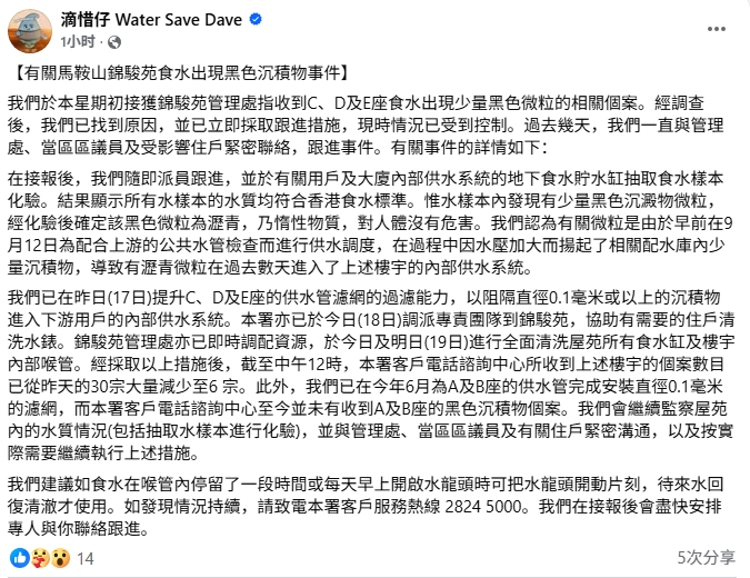 水務署表示,接獲錦駿苑食水出現黑色微粒等個案後,隨即派員跟進及抽取食水樣本化驗。結果顯示所有水樣本的水質均符合香港食水標準,惟水樣本內發現的少量黑色沉澱物微粒,經化驗後確定為瀝青的惰性物質,對人體沒有危害。經調查相信,有關微粒是由於上周五(12日)上游的公共水管檢查時的供水調度,過程中因水壓加大揚起配水庫內少量沉積物,導致有瀝青微粒在過去數天進入樓宇的內部供水系統。