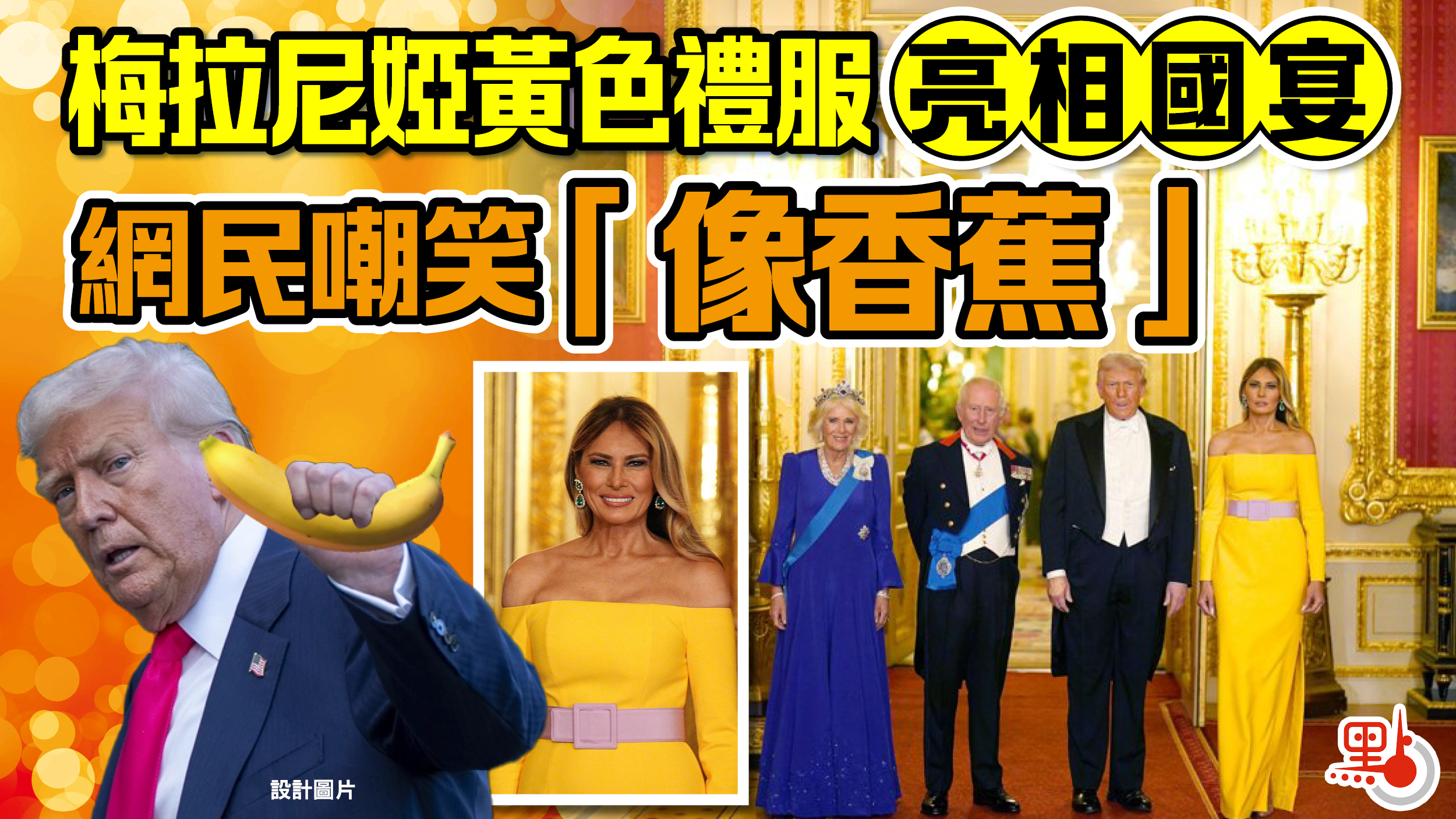 【點新聞報道】美國總統特朗普夫婦國事訪問英國,英王查爾斯三世在溫莎城堡舉行國宴款待,第一夫人梅拉尼婭以黃色露肩禮服亮相,但這套服裝引發網民兩極評價,有人嘲笑「像香蕉」,也有人認為大方得體。此外,她在皇室接待時戴上巨大的深色禮帽,導致頭部被完整遮住,也被網民調侃是「加入證人保護計劃」。