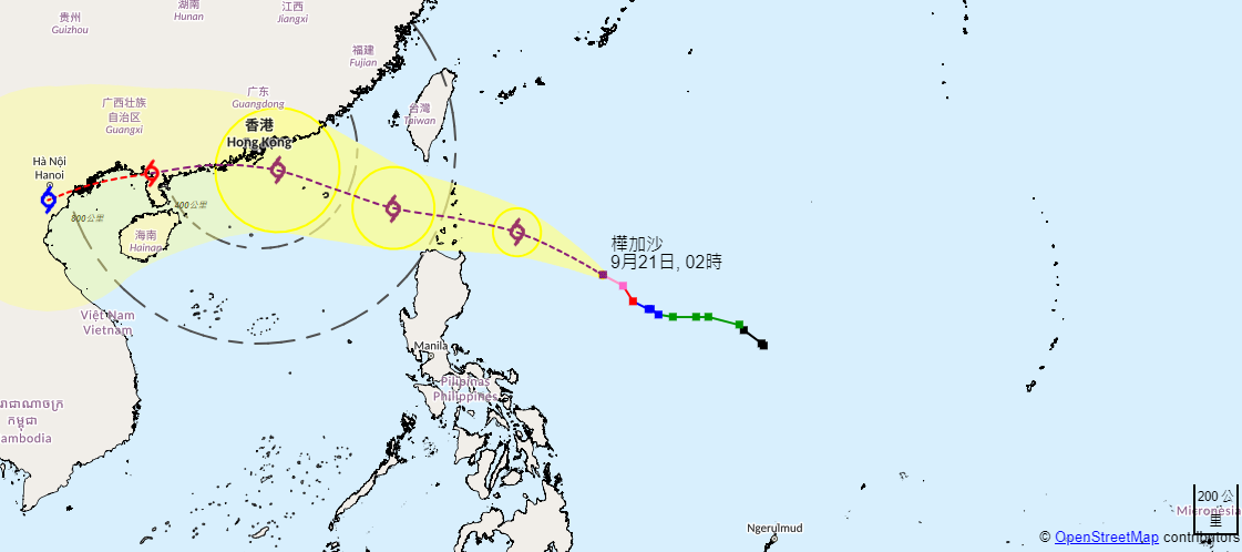 按照天文台今日凌晨2時的預測,超強颱風「樺加沙」周一(22日)晚上進入本港之東南800公里警戒範圍,到周二(23日)凌晨2時移至東南600公里,其時中心附近最高持續風速升至每小時220公里,到晚上進入本港400公里範圍。「樺加沙」料周三(24日)日間最近香港,在珠海市佳蓬列島以南海域掠過,即相距香港北面沙頭角約100公里。