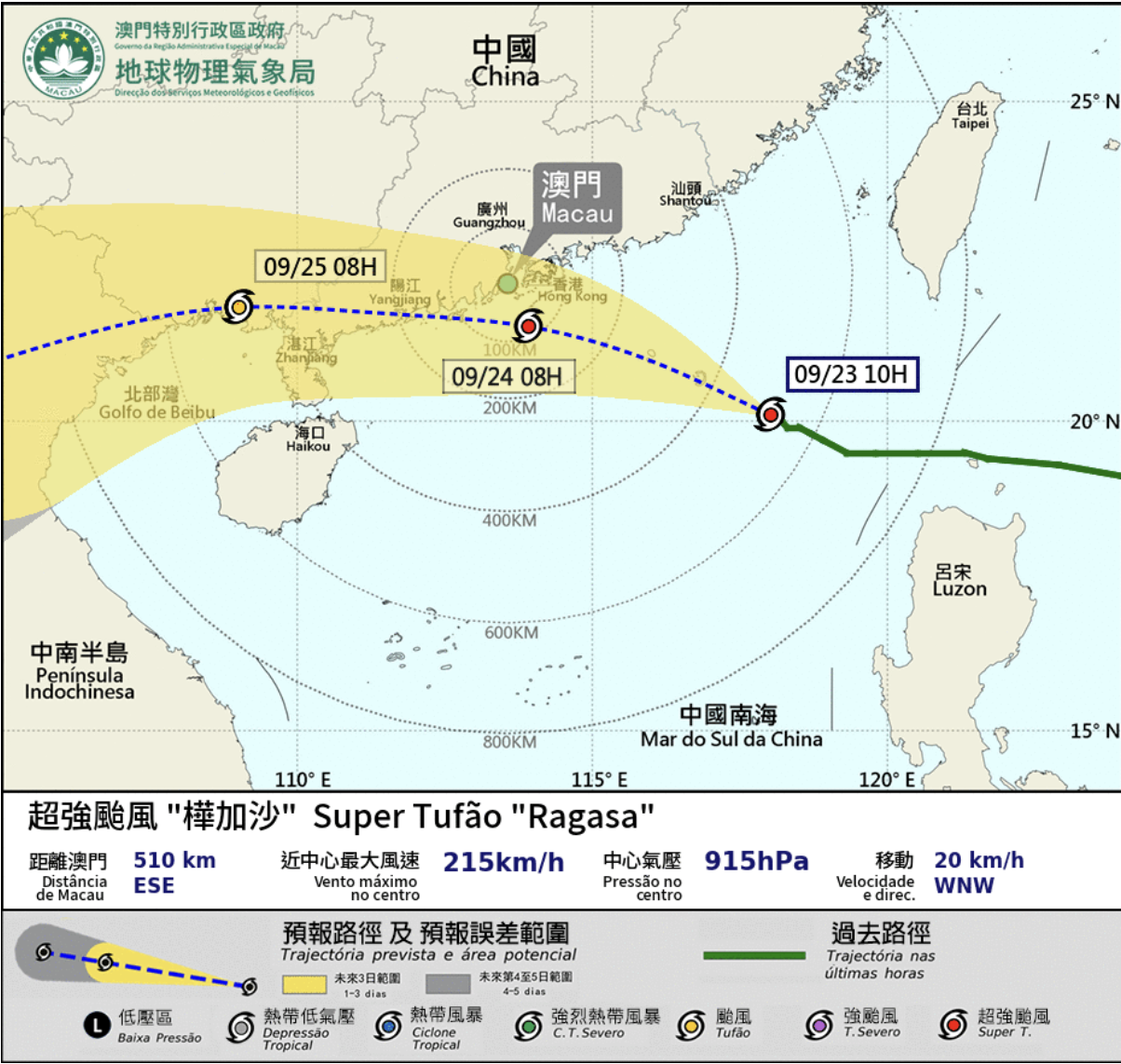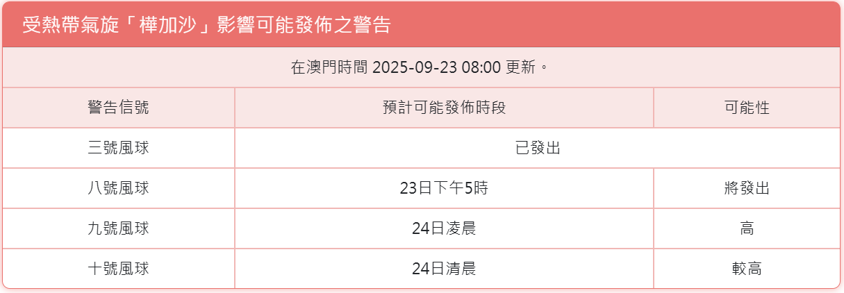 澳門氣象局預計,「樺加沙」於周三(24日)凌晨至早上將會相當接近珠江口,不排除於澳門100公里內掠過,屆時澳門風力有機會達12級颶風或以上,且最大風力持續時間較長,有持續狂風暴雨及雷暴,高層樓宇需提防因颶風或以上風力所帶來的嚴重影響。同時,亦將出現顯著的風暴增水,如增水與天文潮高潮位時間重疊,周三日間有機會出現與「天鴿」和「山竹」水平相若的風暴潮水浸,因此局方將於今日下午1時發出橙色風暴潮警告,而下午至晚間改發紅色風暴潮警告機會較高。