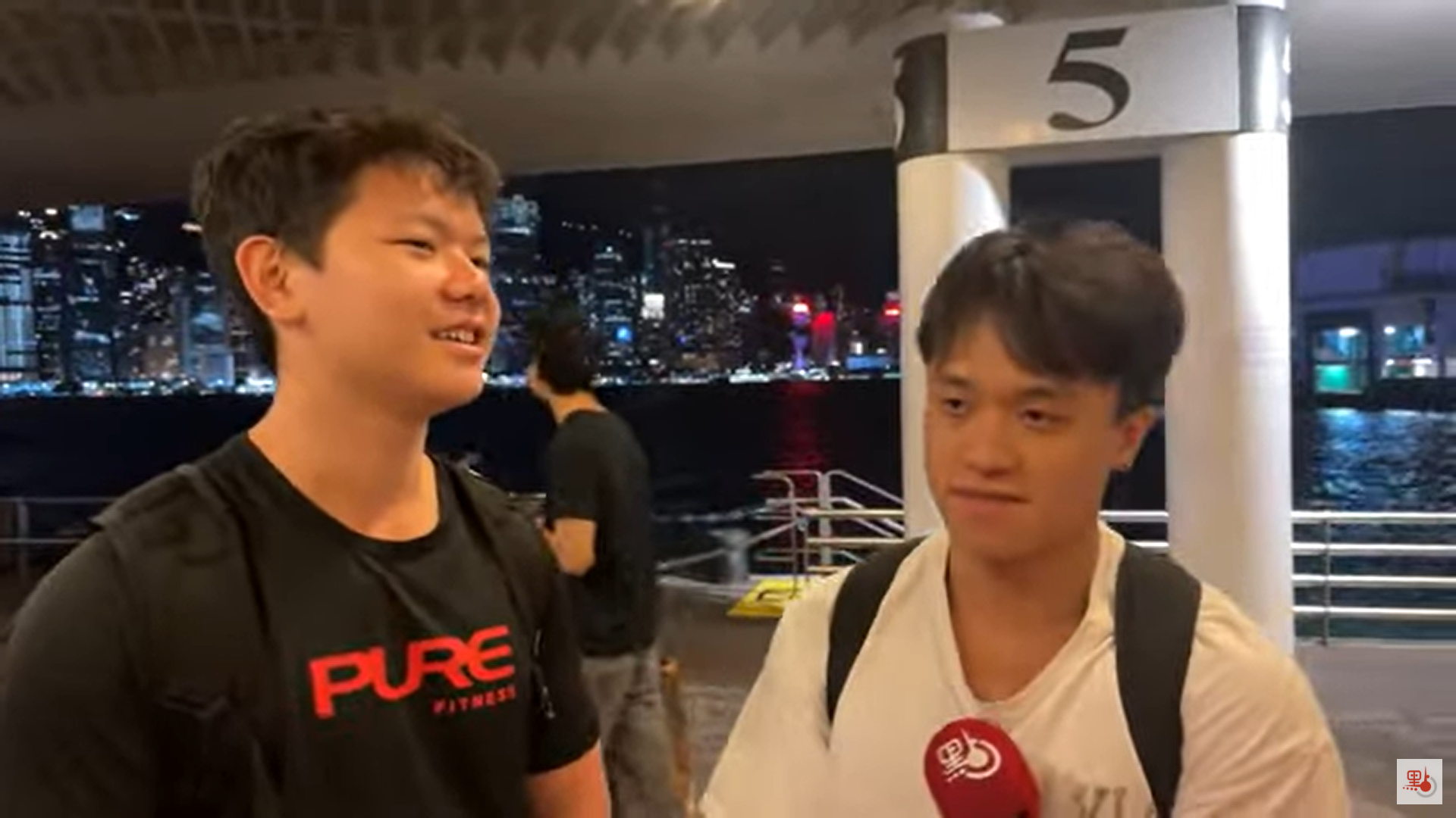 市民梁先生和朋友陳先生正巧路過尖沙咀海旁,他感覺目前風平浪靜,和預期不太一樣,但早前留意到杏花邨一帶風浪十分強勁。對於冒險追風的行為,他認為「求開心,但也要注意安全,安全第一」。