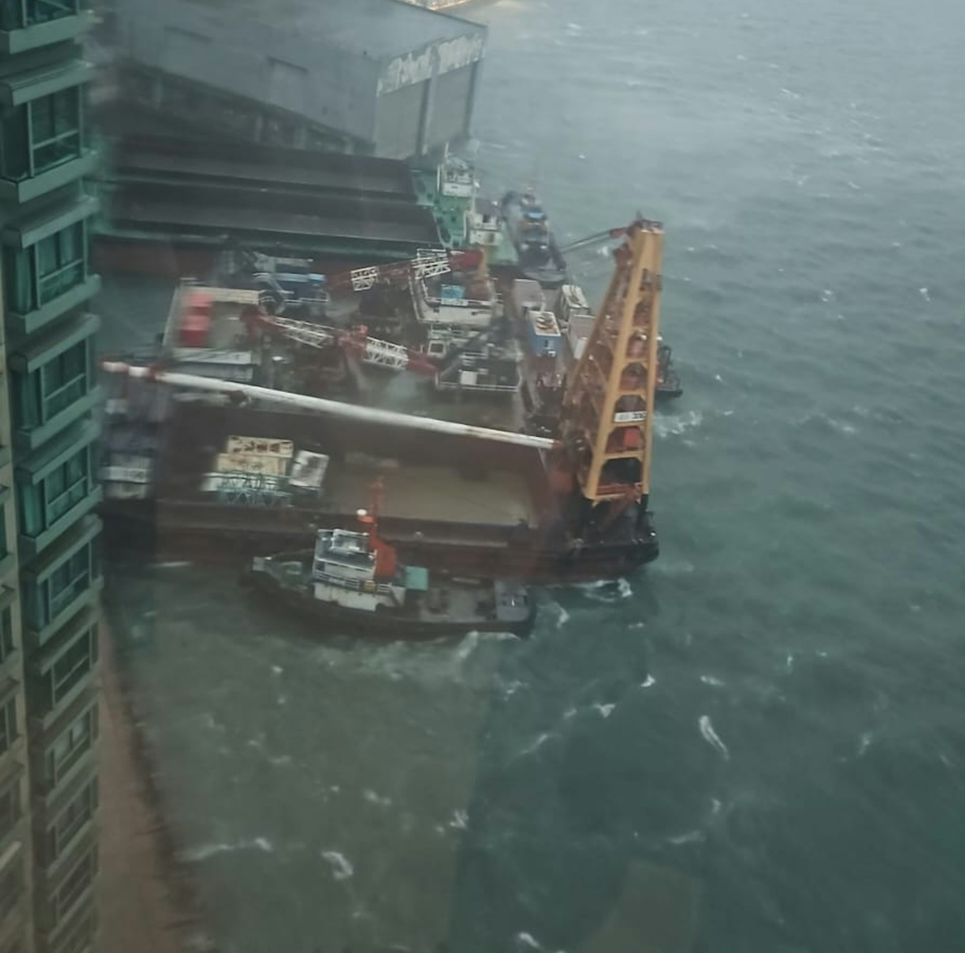 紅磡海逸豪園對出的海面,一艘躉船在風暴之下懷疑被強風吹到撞岸。(網上圖片)