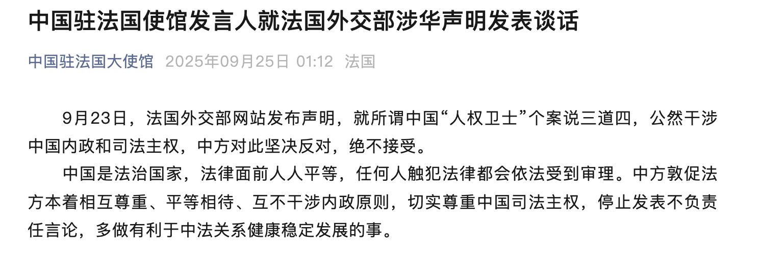 9月23日,法國外交部網站發布聲明,就所謂中國「人權衛士」個案說三道四,公然干涉中國內政和司法主權,中方對此堅決反對,絕不接受。