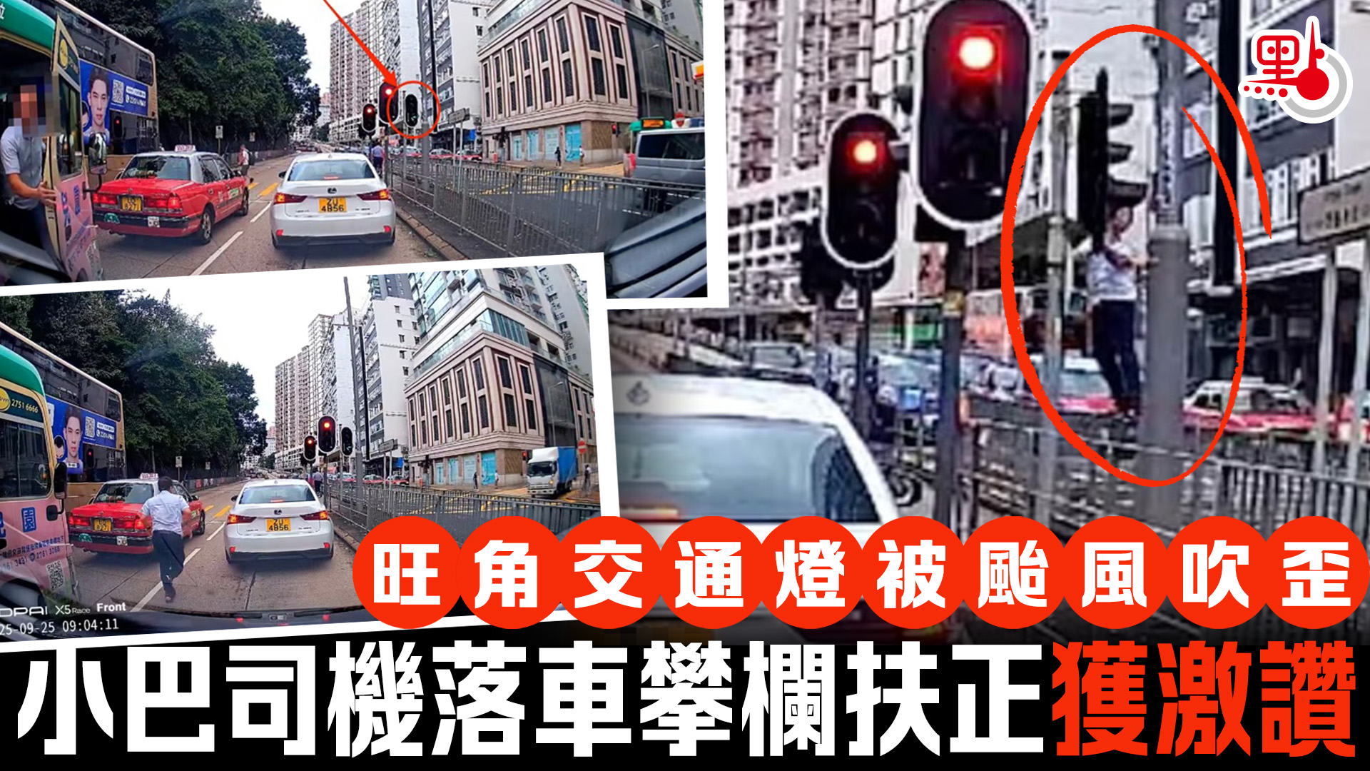 旺角交通燈被颱風吹歪 小巴司機落車攀欄扶正獲激讚