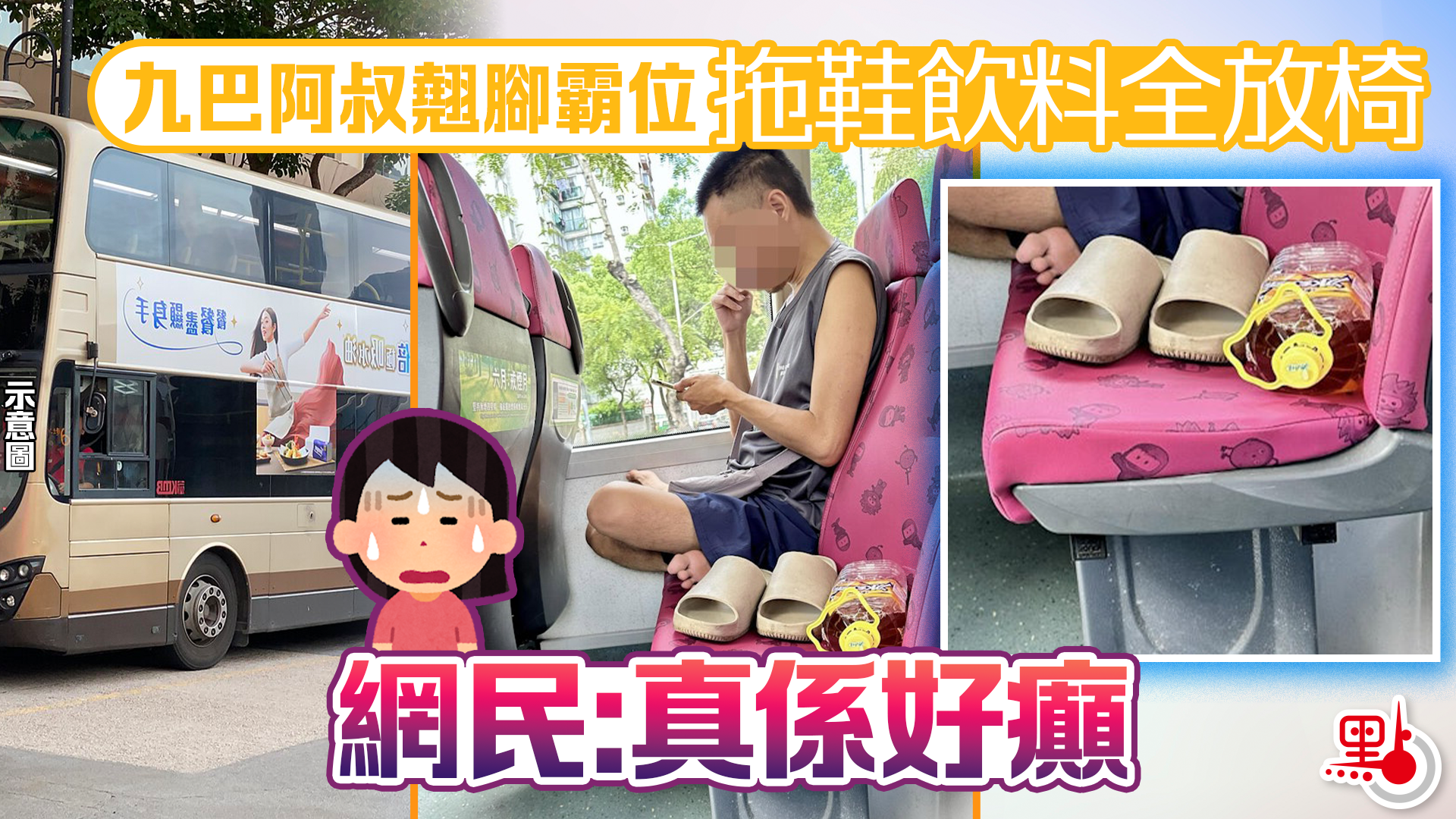九巴阿叔翹腳霸位 拖鞋飲料全放椅 網民:真係好癲