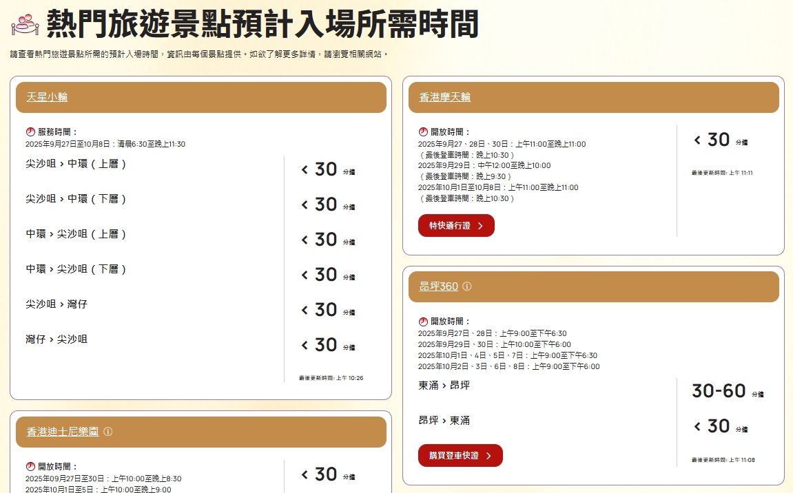 在內地國慶黃金周假期期間,旅發局亦會於專頁內提供本港的熱門旅遊景點的輪候時間,包括香港迪士尼樂園、香港海洋公園、山頂纜車、昂坪360纜車、香港摩天輪,以及不少旅客選擇乘搭的天星小輪,讓市民及旅客更便捷地計劃行程。