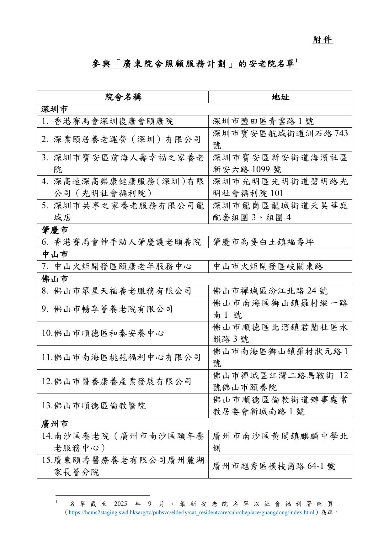 【點新聞報道】政府明日(10月1日)推出由關愛基金資助的「綜合社會保障援助長者入住廣東院舍試驗計劃」,為期3年,旨在資助選擇赴粵養老的綜合社會保障援助受助長者入住「廣東院舍照顧服務計劃」下的安老院,提升生活質素。每名合資格長者每月可獲港幣5000元資助,名額共1000個。