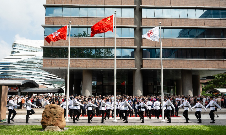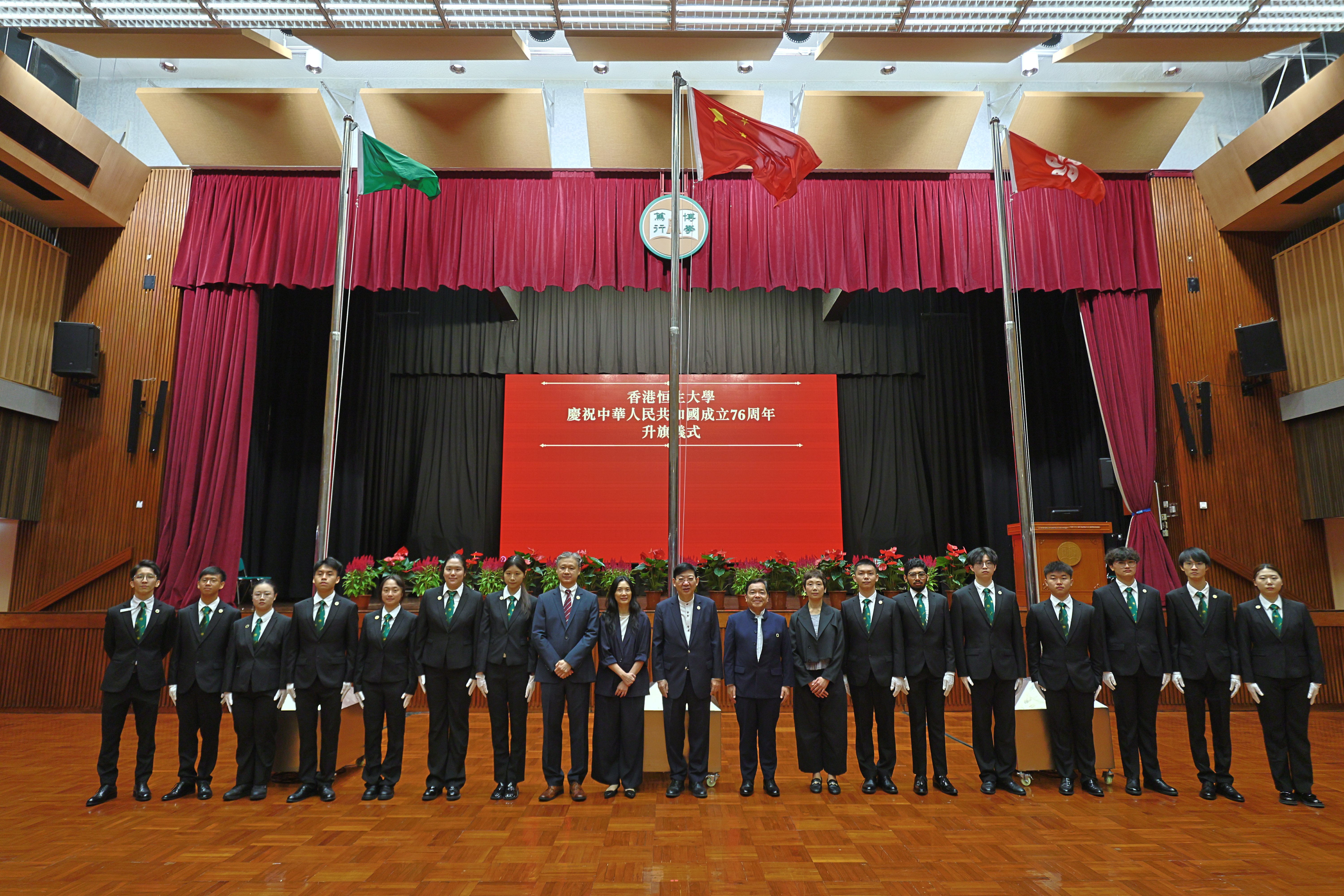 香港大學(港大)今日在百周年校園李兆基會議中心大會堂舉行升旗儀式,慶祝中華人民共和國成立76周年。港大校務委員會主席王冬勝及校長張翔,連同校務委員會和教務委員會成員、學院院長、教職員和學生及獲邀嘉賓等一同出席升旗儀式。