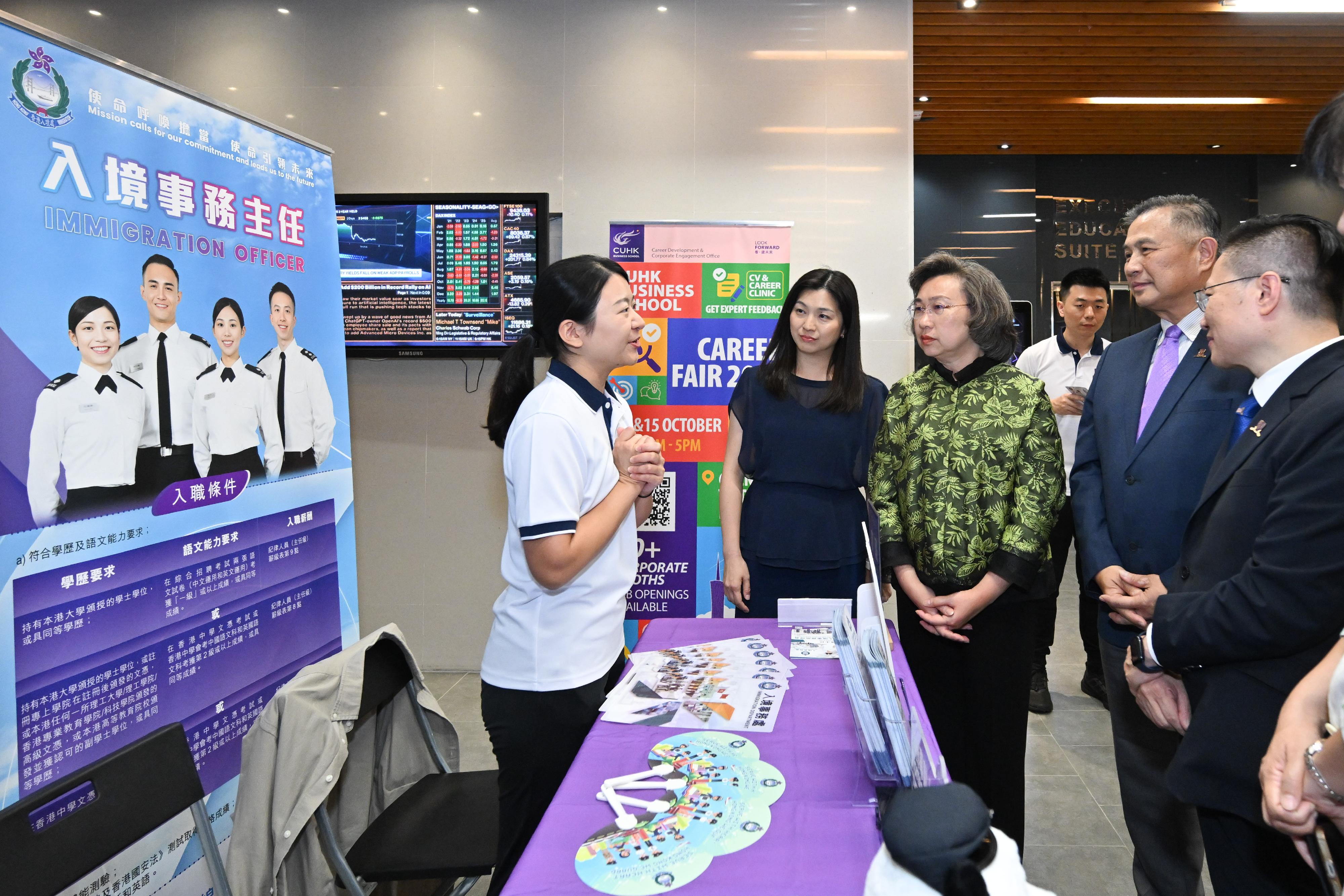 【點新聞報道】公務員事務局局長楊何蓓茵今日(10月2日)下午與中大副校長(教育)金國慶,一同參觀在中大校園舉行的政府職位招聘展覽,鼓勵大學生按自己的志趣多了解政府不同部門的工作,以及政府為年輕人提供的就業機會,及早做好生涯規劃。公務員事務局是第3年與中大合辦招聘展覽,為大學生提供一站式實用的招聘資訊,而同學亦可以即場向來自不同職系的現職公務員提問。