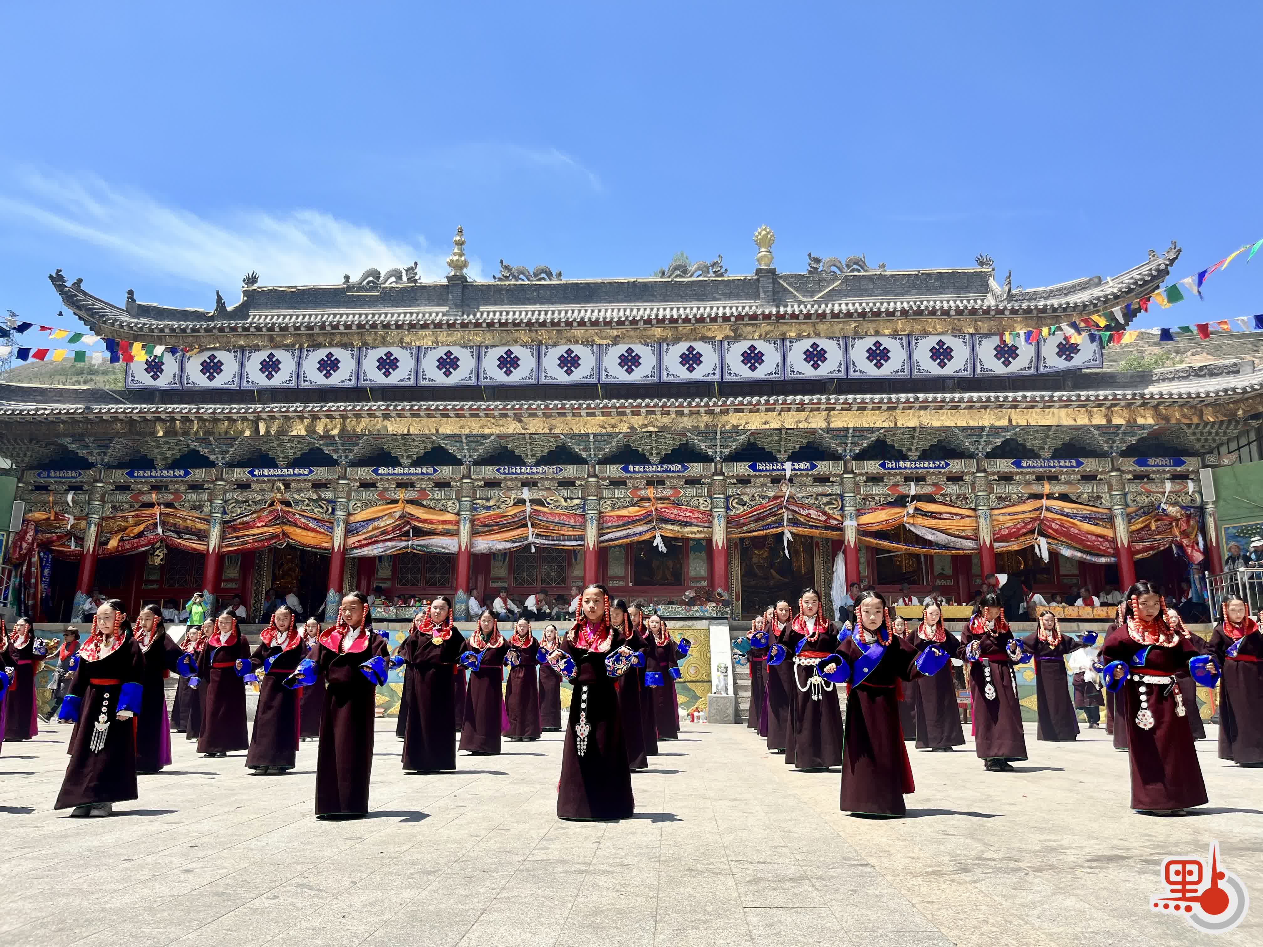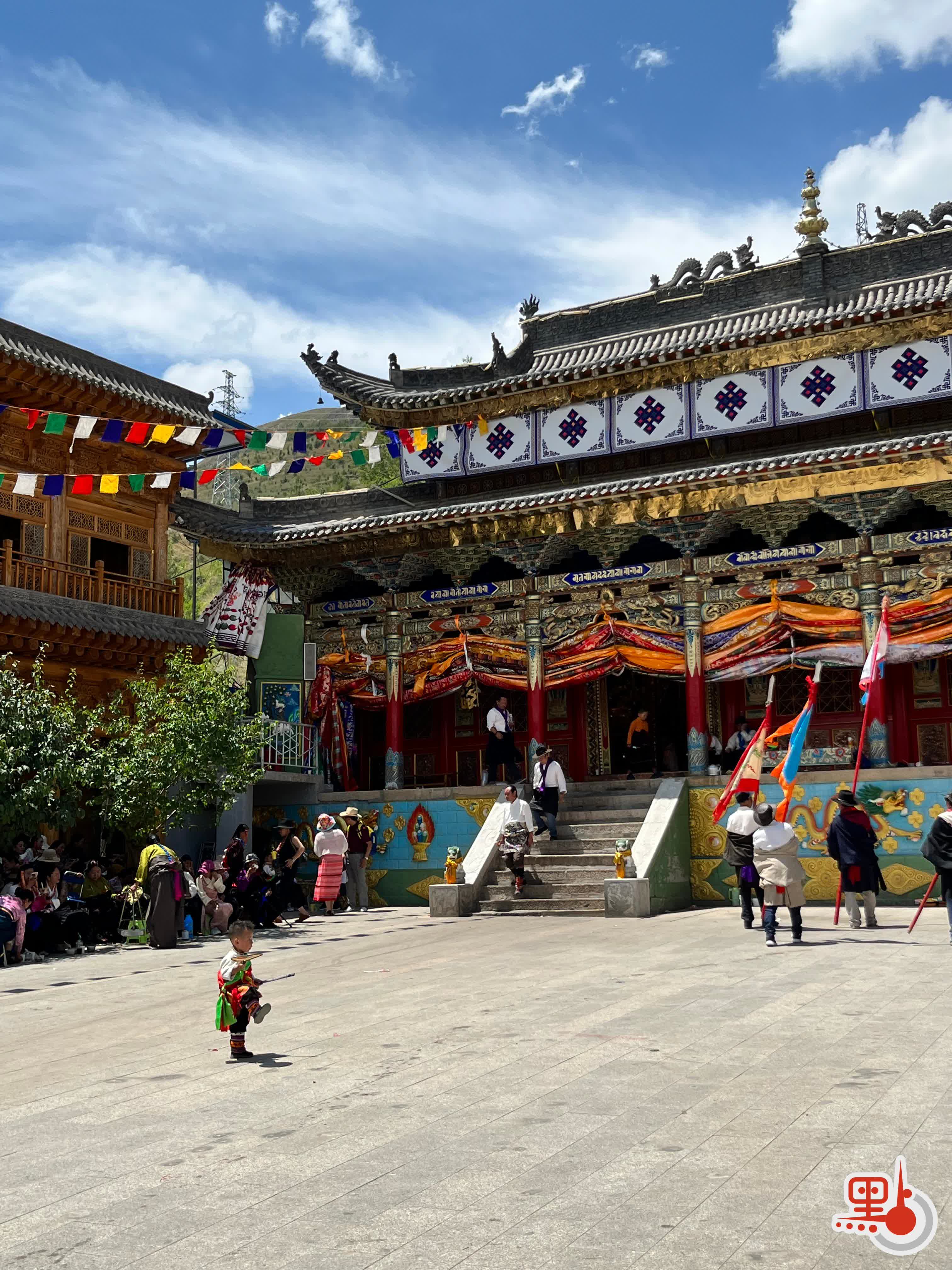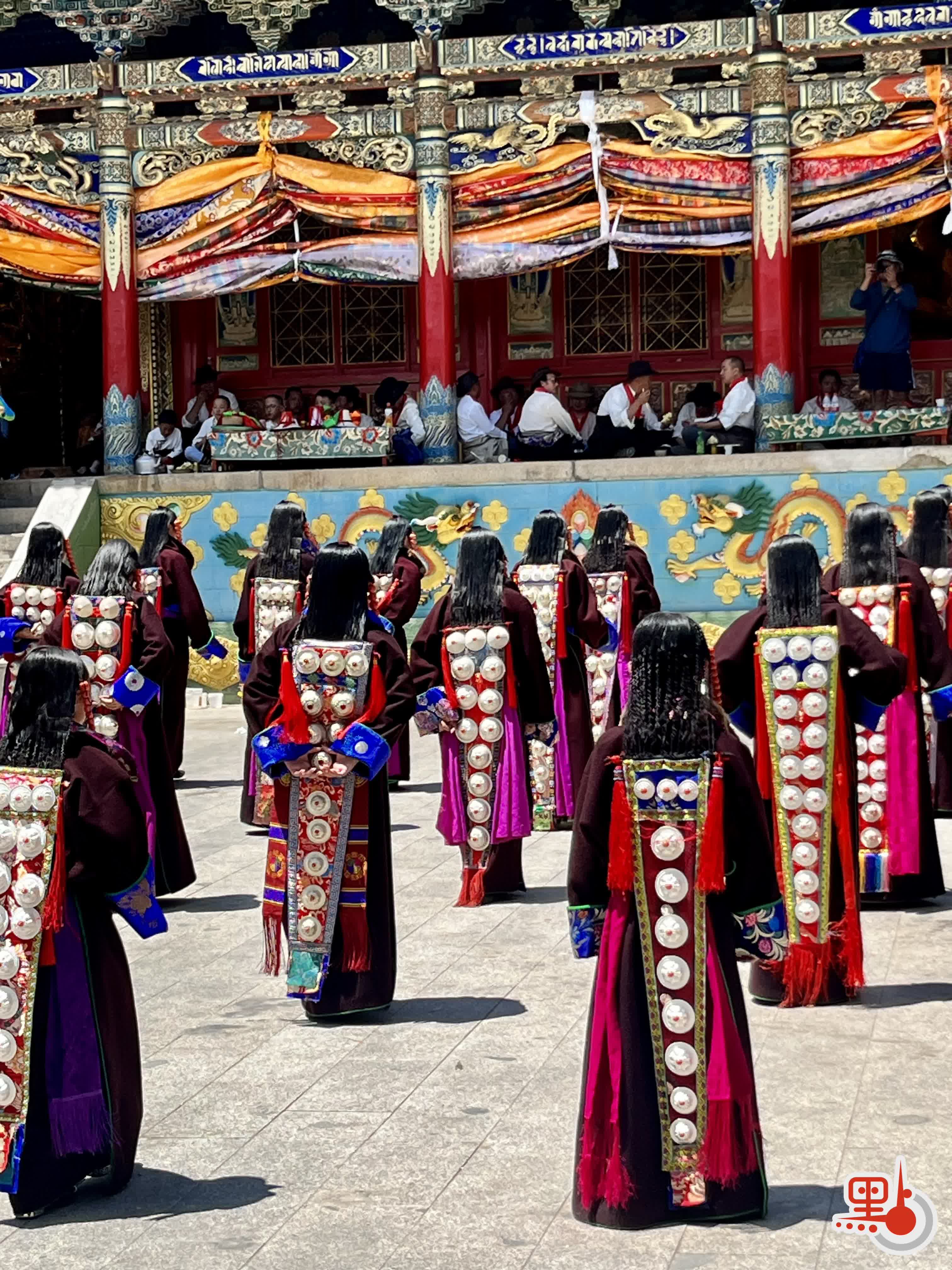 時值大暑時節,烈日當空,碧空如洗。我跟隨着人流來到了廟宇大殿旁,放眼望去,只有我一個遊客與身旁一位捧着單反相機的攝影師。此時,村民們已經聚集完畢,一場樸素而虔誠的祭祀正在進行。銅鑼聲鏗鏘有力,鼓聲沉穩厚重,在廟前空地上,五排盛裝少女亭亭而立。她們身着亮麗的藏族服飾,深紫色的藏袍點綴着桃紅腰帶,袖口翻出靛藍錦緞,耳畔佩戴着誇張的珊瑚瑪瑙串珠,隨着步伐搖曳生姿。她們步履緩慢而莊重,舞姿整齊劃一,每一個動作都充滿了儀式感。