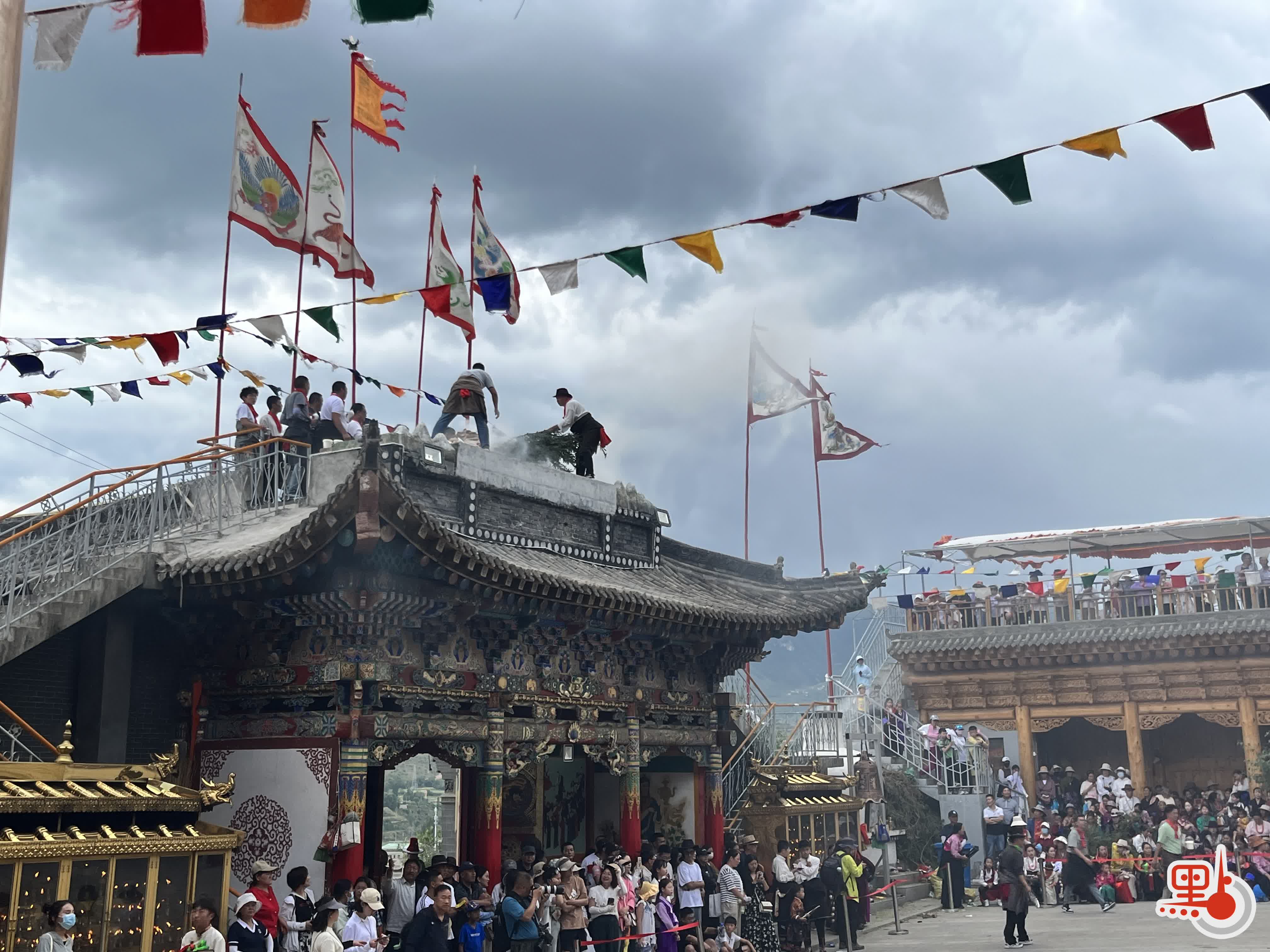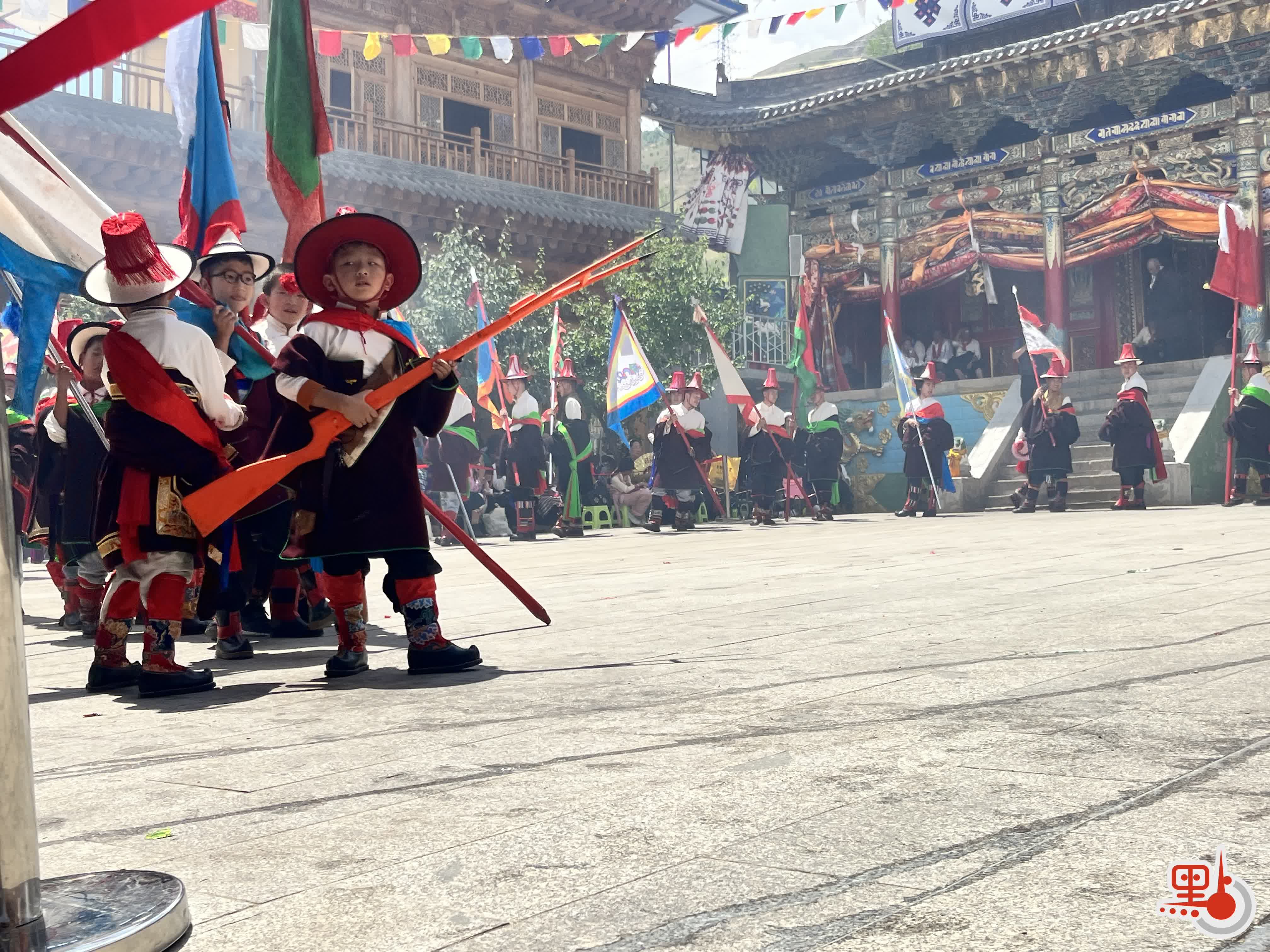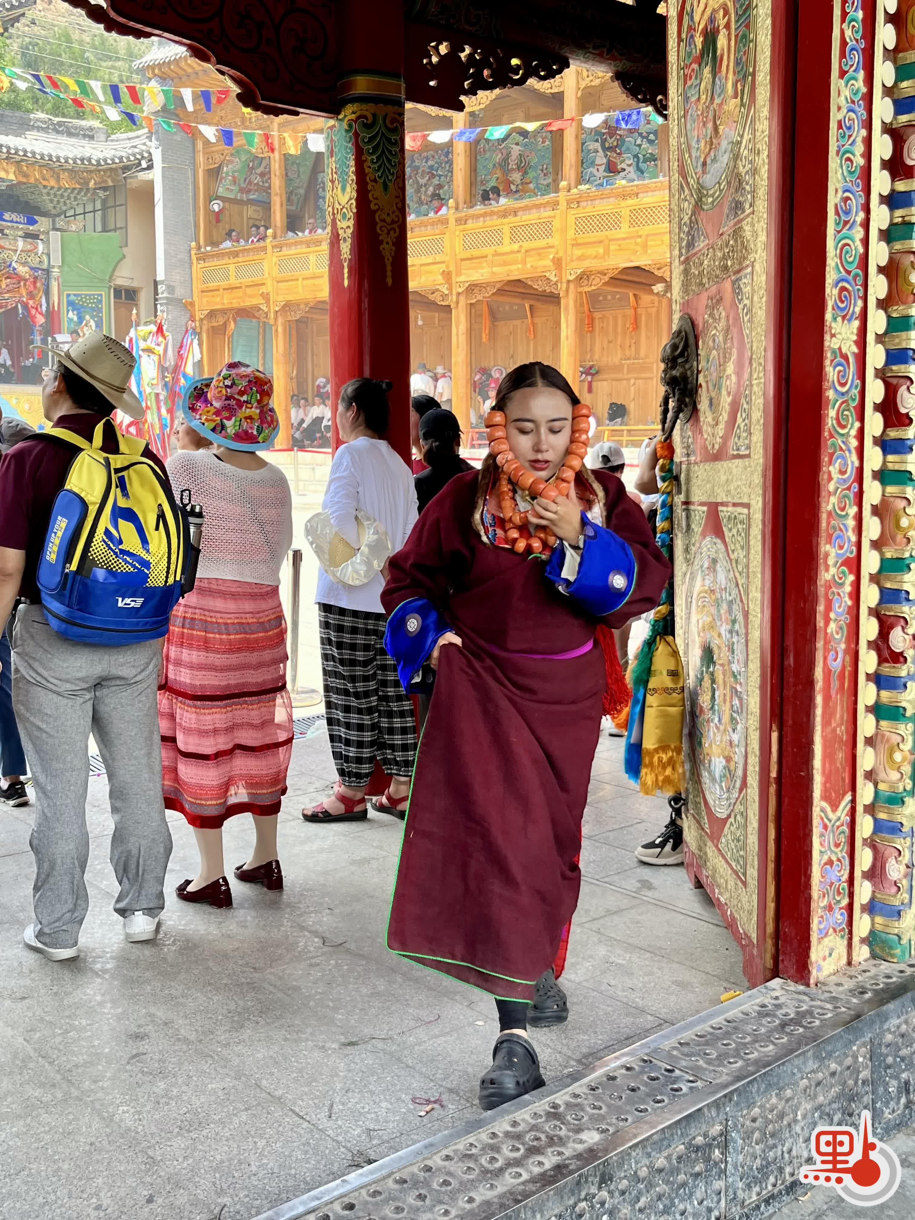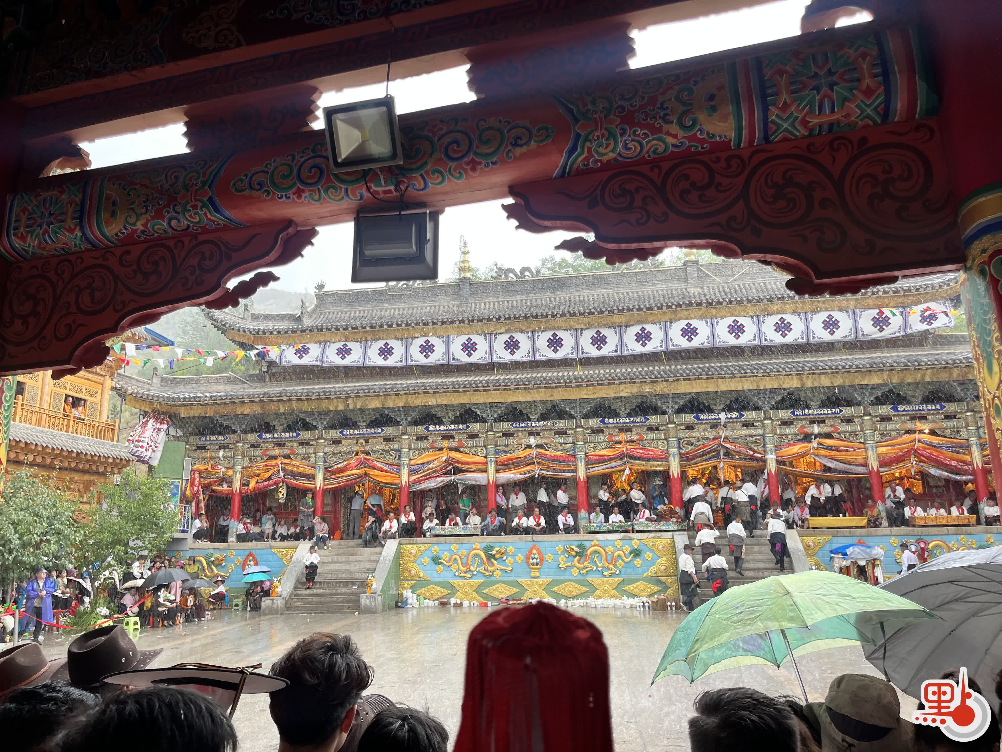 時值大暑時節,烈日當空,碧空如洗。我跟隨着人流來到了廟宇大殿旁,放眼望去,只有我一個遊客與身旁一位捧着單反相機的攝影師。此時,村民們已經聚集完畢,一場樸素而虔誠的祭祀正在進行。銅鑼聲鏗鏘有力,鼓聲沉穩厚重,在廟前空地上,五排盛裝少女亭亭而立。她們身着亮麗的藏族服飾,深紫色的藏袍點綴着桃紅腰帶,袖口翻出靛藍錦緞,耳畔佩戴着誇張的珊瑚瑪瑙串珠,隨着步伐搖曳生姿。她們步履緩慢而莊重,舞姿整齊劃一,每一個動作都充滿了儀式感。