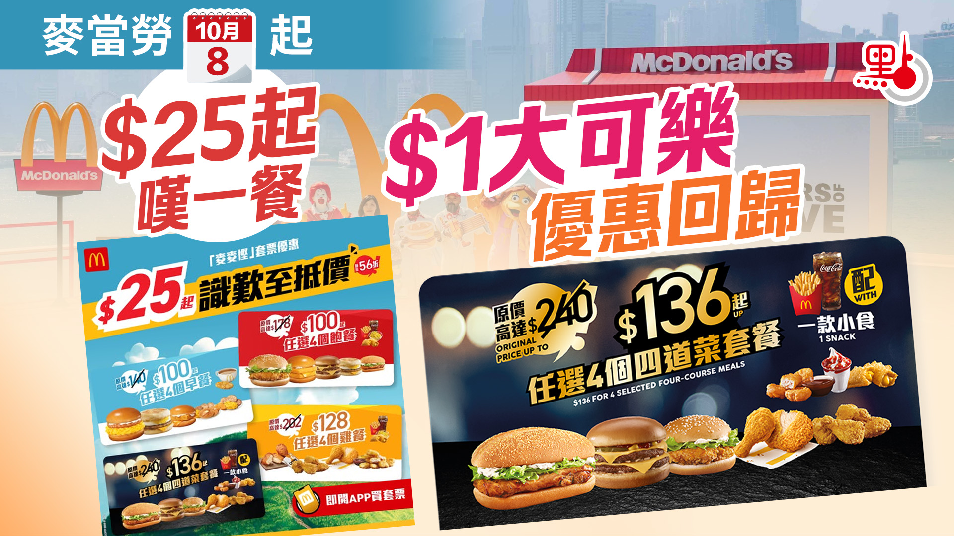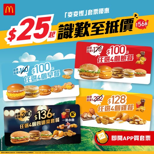 【點新聞報道】麥當勞「麥麥慳」套票優惠回歸,由即日(8日)起,可以低至$25嘆指定套餐,包括「飽你鍾意套餐」、「着數之晨套餐」、「雞會難得套餐」,「四重滋味套餐」亦同步回歸,$136起便可吃盡4個套餐配一款指定小食,套餐換購券可於2025年11月23日或以前使用。同時,麥當勞App亦帶來「$1大可樂」優惠!